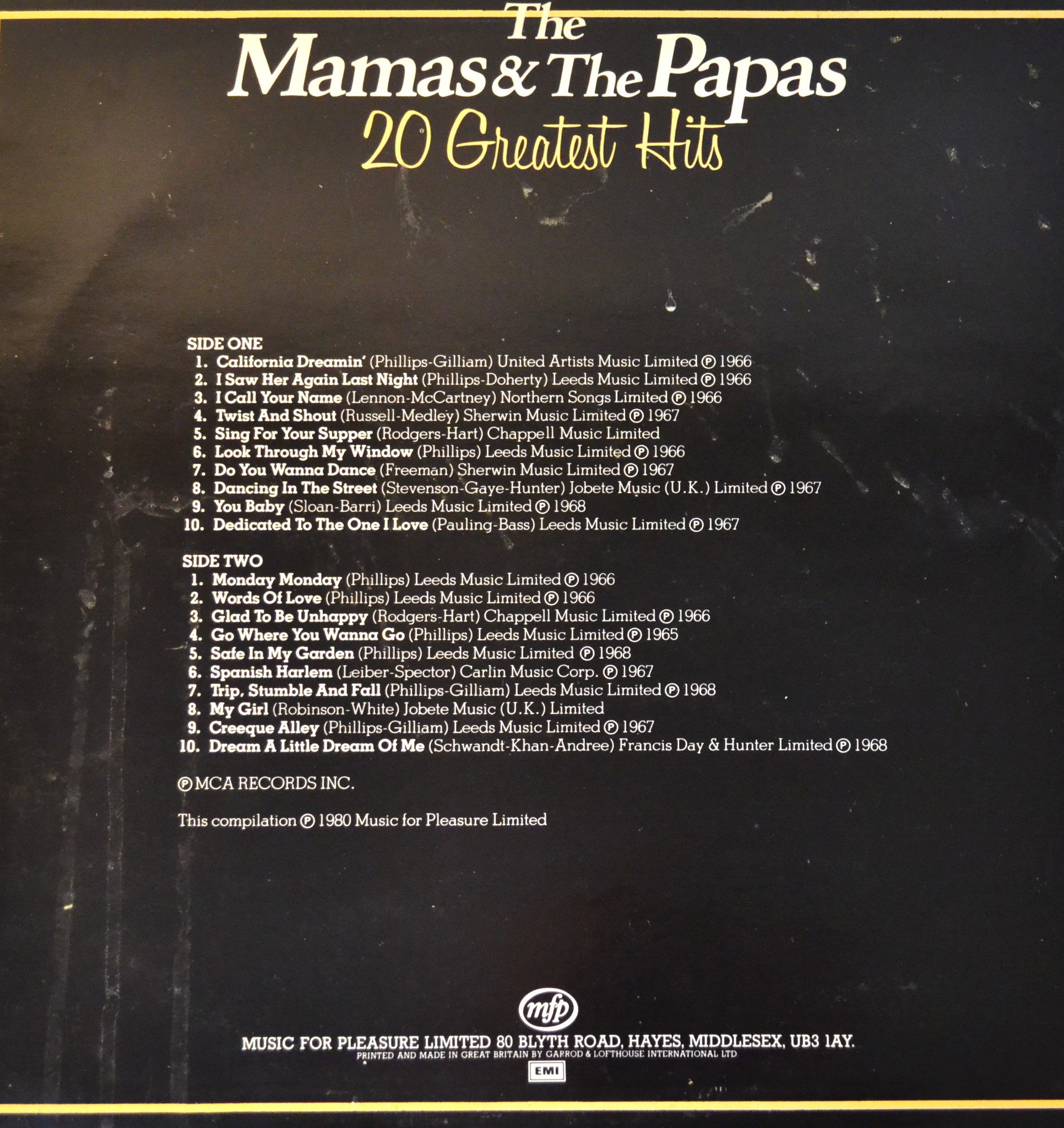 Dive into the harmonious world of folk-rock with “The Mamas & The Papas – 20 Greatest Hits,” a timeless vinyl treasure from 1980. This UK edition, catalog number MFP 50493, brings together the quintessential tracks that defined an era. Released by Music For Pleasure in collaboration with MCA Records, Inc., and pressed by the renowned Garrod & Lofthouse International Ltd., this collection is a must-have for enthusiasts of classic Pop Rock. Featuring hits licensed from United Artists Music Ltd., Leeds Music Ltd., Northern Songs Ltd., and more, each song resonates with the craftsmanship of iconic labels like Sherwin Music Ltd., Chappell Music Ltd., Jobete Music (UK) Ltd., Carlin Music Corp., and Francis, Day & Hunter Ltd. Spin this vinyl and let “The Mamas & The Papas – 20 Greatest Hits” fill your space with the legendary sounds that still captivate listeners today.