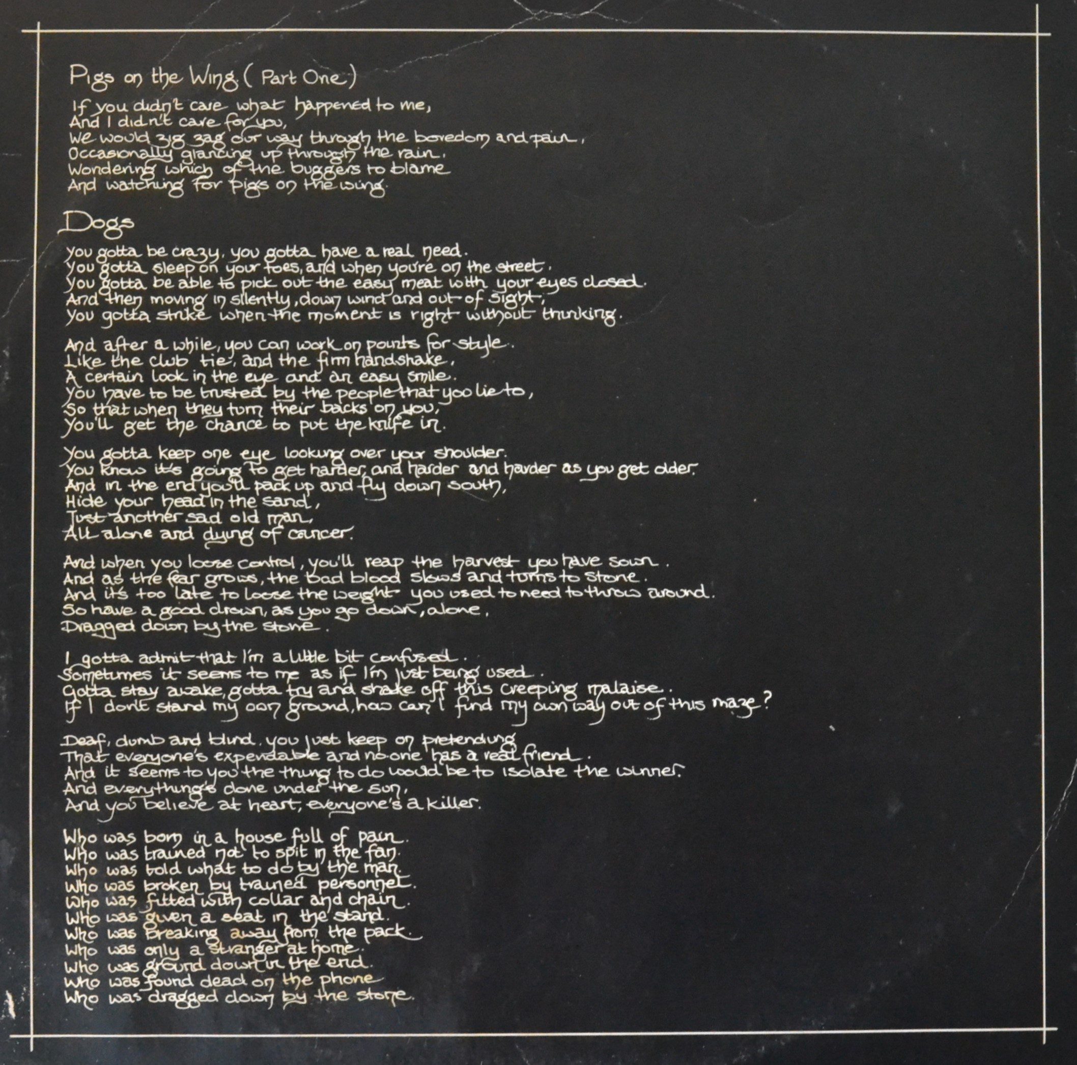 “Animals” consists of five tracks, each representing different classes of society through animal allegories. The lyrics, primarily written by Roger Waters, are biting and cynical, reflecting his disillusionment with the political climate. Musically, the album blends progressive rock with blues and hard rock elements, featuring extended instrumental passages and complex arrangements.