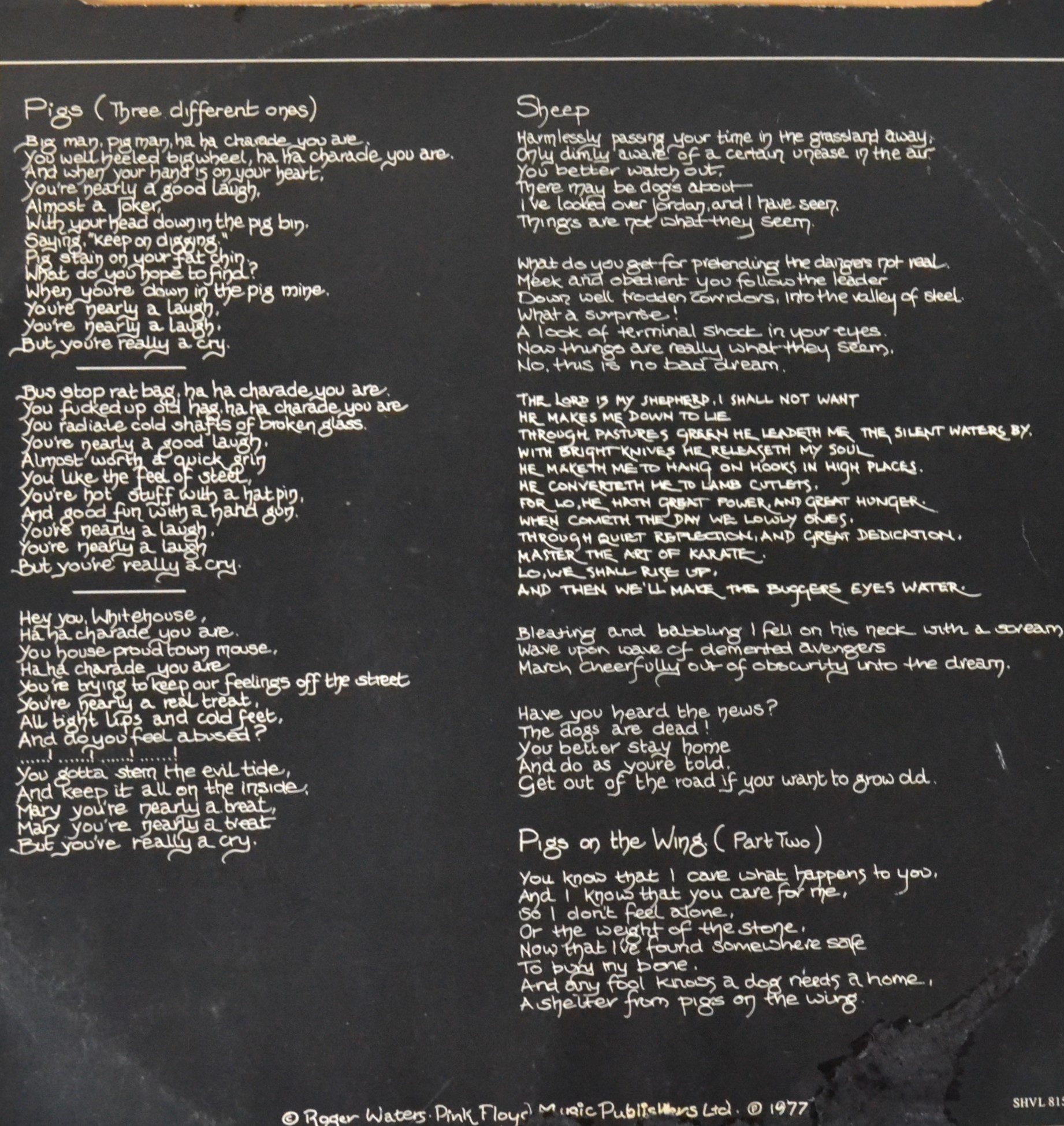 Recorded at Britannia Row Studios and released under EMI Records, “Animals” is a concept album that critiques the socio-political landscape of the 1970s. The album was published by Pink Floyd Music Publishers Ltd., with phonographic and copyright rights held by Pink Floyd Music Ltd. and Roger Waters. The record has an original inner sleeve.