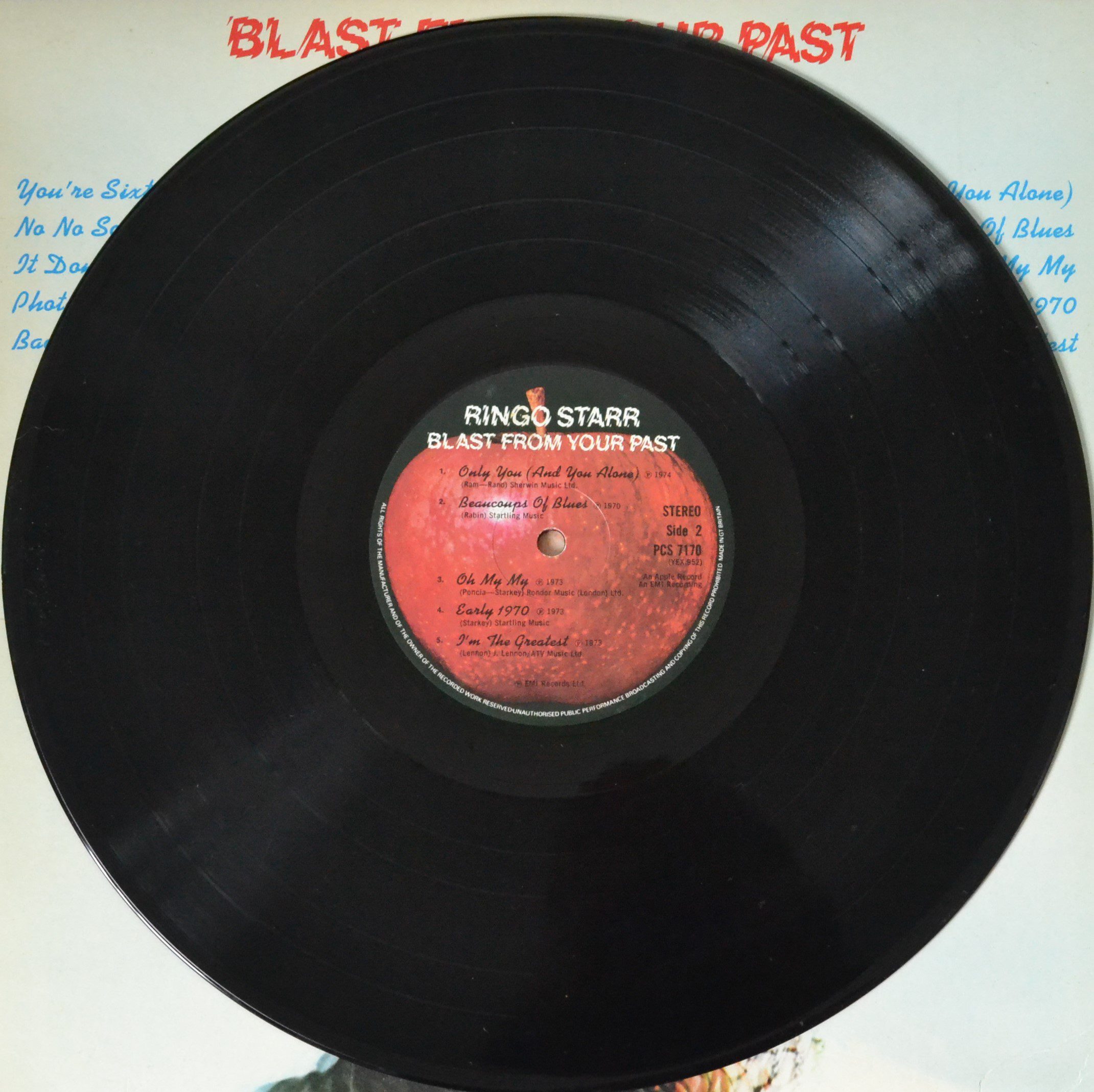“Blast from Your Past” by EMI Records Ltd. features tracks lacquer-cut at Abbey Road Studios. Printed by Garrod & Lofthouse Ltd., it includes works published by Jewel Music Ltd., Rondor Music (London) Ltd., Startling Music, Richoroony Ltd., Sherwin Music Ltd., John Lennon, and ATV Music Ltd.