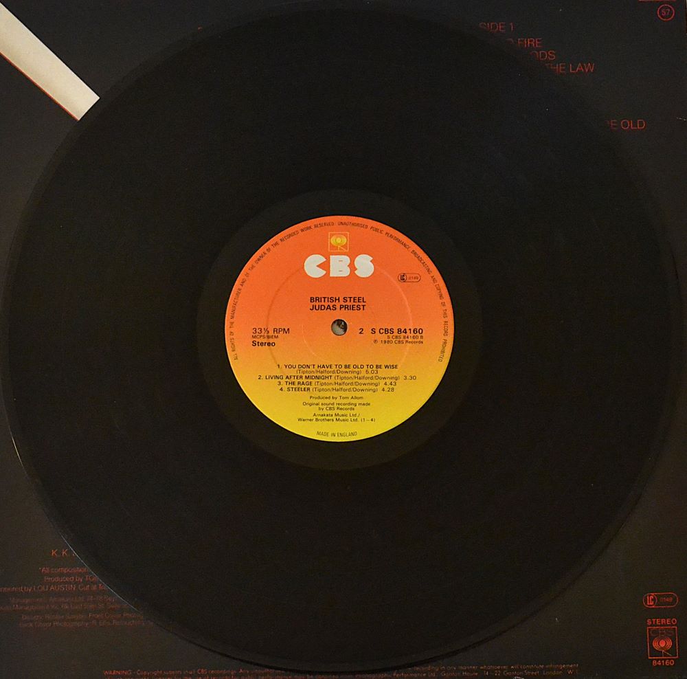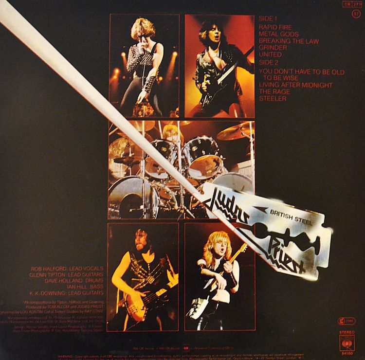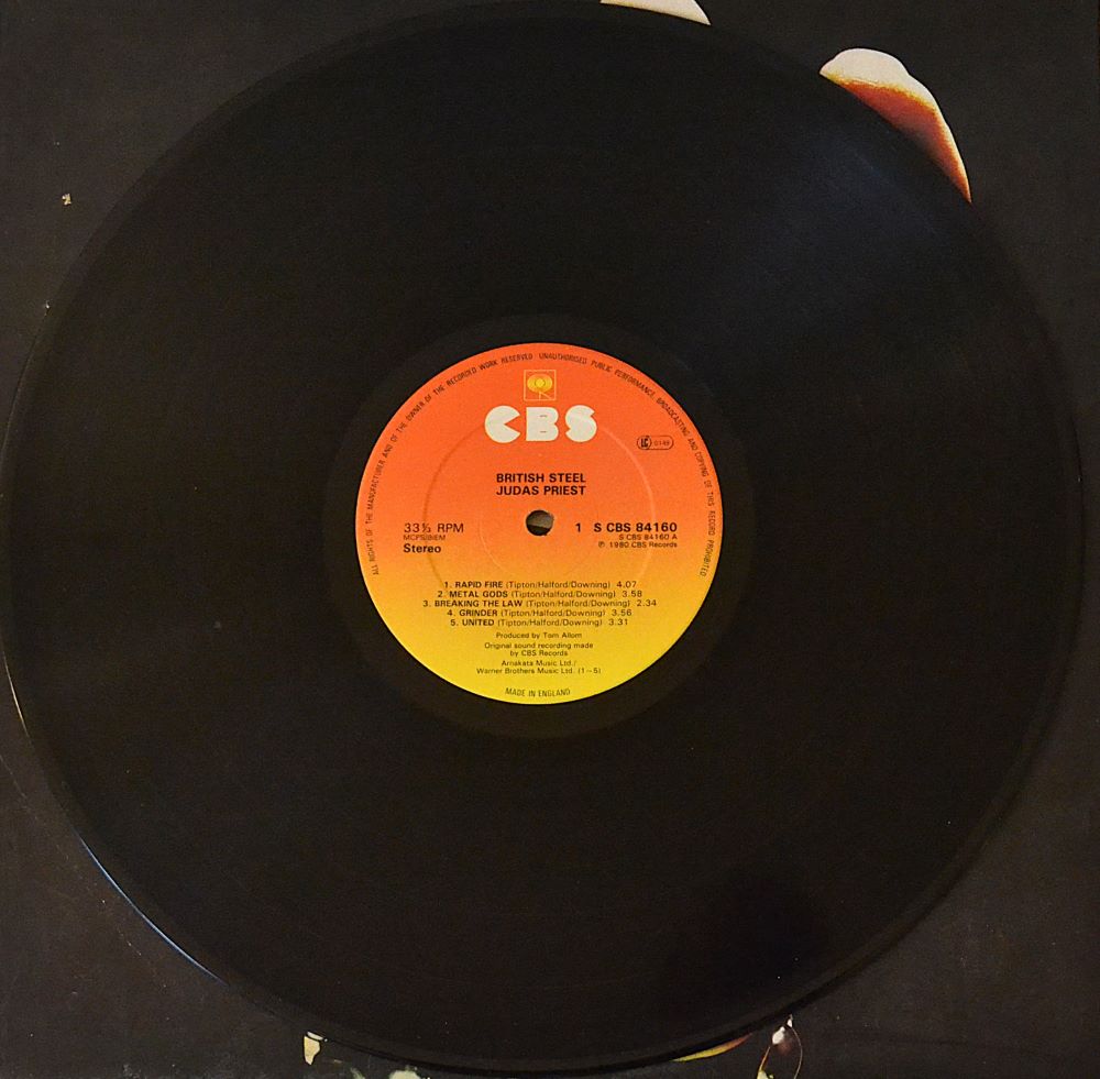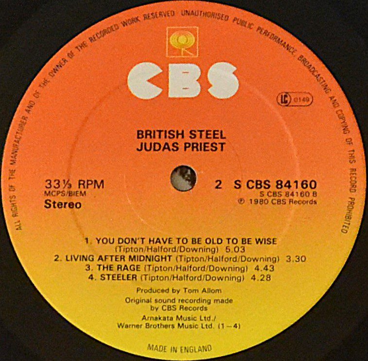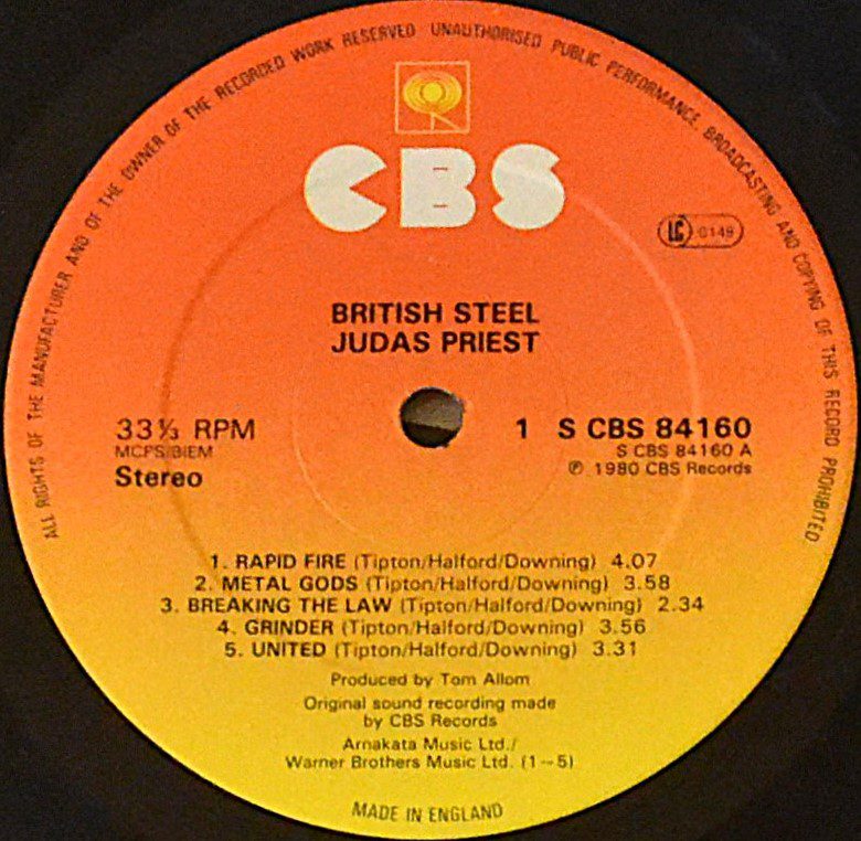 The classic Judas Priest album British Steel was recorded at Startling Studios and lacquered at Trident Studios. ℗ and © CBS Records, published by Arnakata Music Ltd. and Warner Bros. Music Ltd., expertly pressed at CBS Pressing Plant, Aston Clinton, United Kingdom.