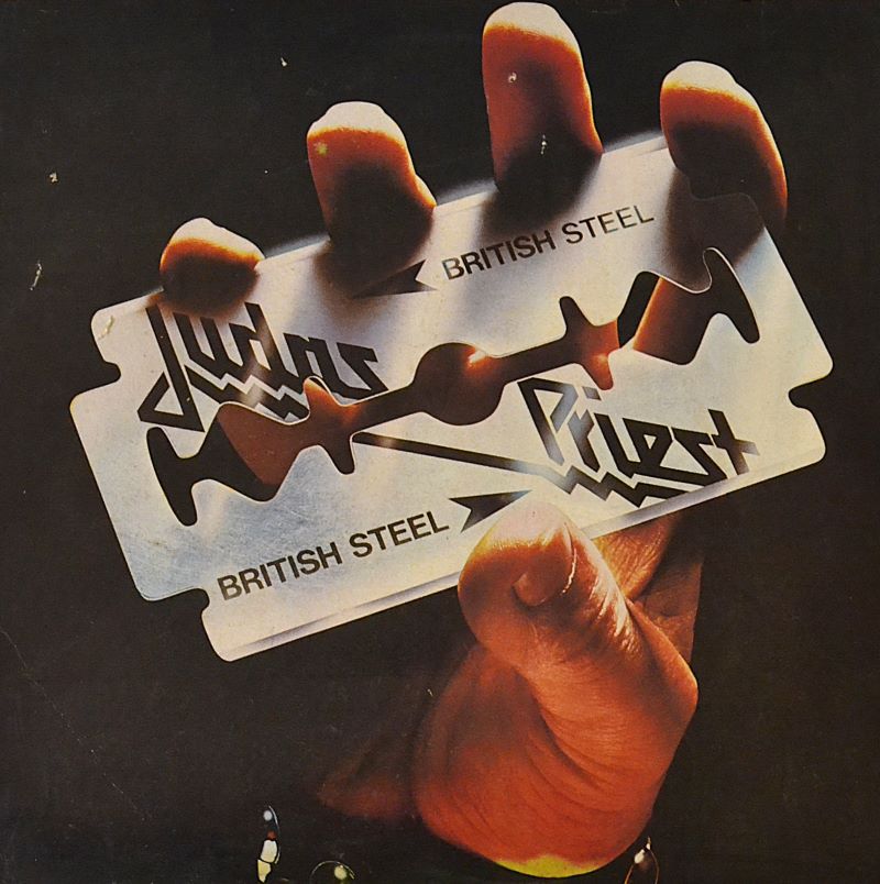 A hand clutching a gleaming razor blade engraved with “Judas Priest – British Steel.”