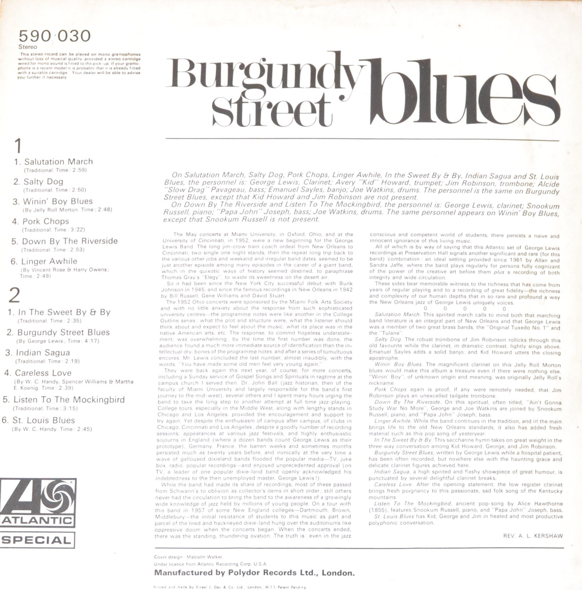 Step back in time with “Burgundy Blues Street,” an album that captures the soulful essence of jazz with an unmistakable blues influence. Recorded by the legendary George Lewis, this vinyl is a celebration of heartfelt melodies and rich, emotional performances. Pressed under Atlantic catalog 590 030, it promises to be a delightful addition to any vinyl enthusiast’s collection.