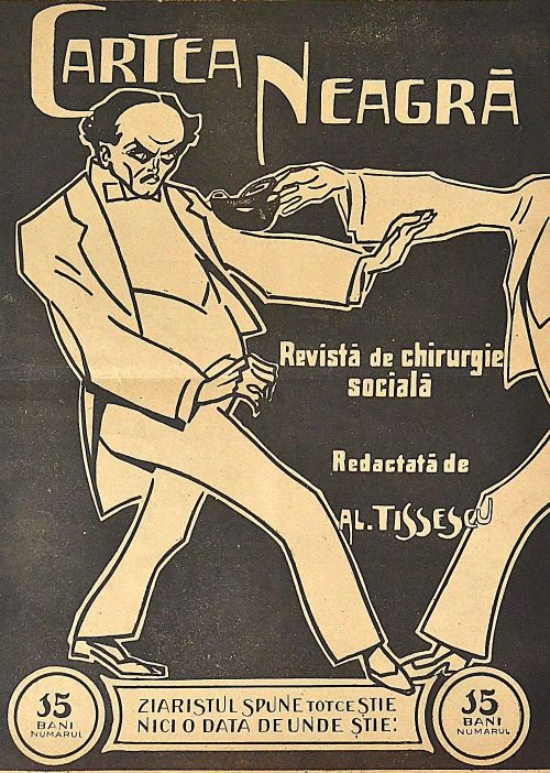 Cartea Neagră is a bold Romanian magazine branding itself a “revista de chirurgie socială.” Its striking cover shows a stern gentleman confronted by an unseen hand, suggesting satire, critique, and social diagnosis. Edited by Al. Tissescu, it promises sharp commentary, exposing what “the journalist knows” and how power shapes truth.