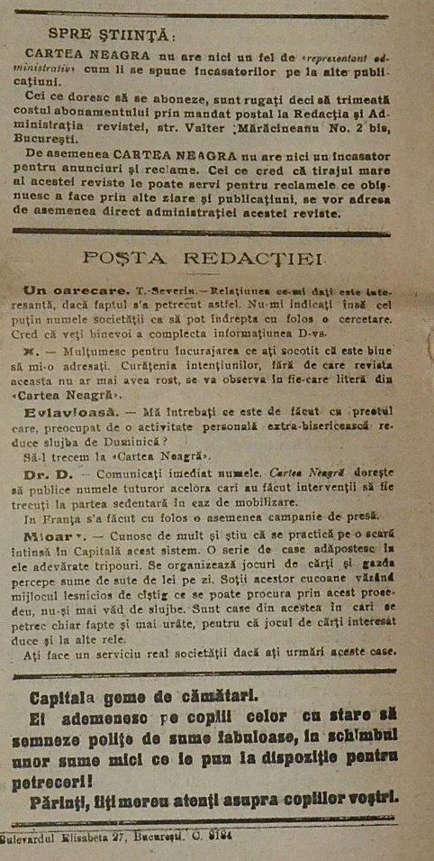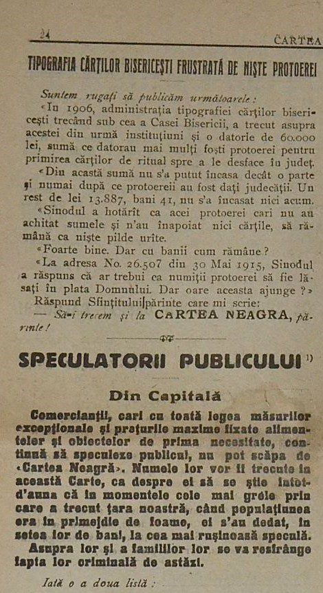 In the pages shown, Cartea Neagră positions itself as a public moral clinic: it names, quotes, and exposes. One issue (marked No. 2, May 1916) even boasts a price tag (15 bani)—basically: “For the cost of a snack, here’s a full serving of accountability.”