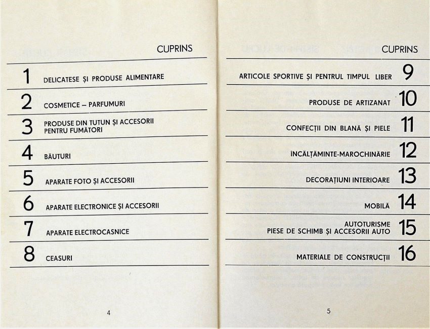 The CUPRINS spread organizes everything into 16 departments—from Delicacies & Food to Electronics, Furniture, Cars, and Construction materials. That’s not “nice design”; it’s operational strategy: fewer questions, fewer returns, faster ordering.