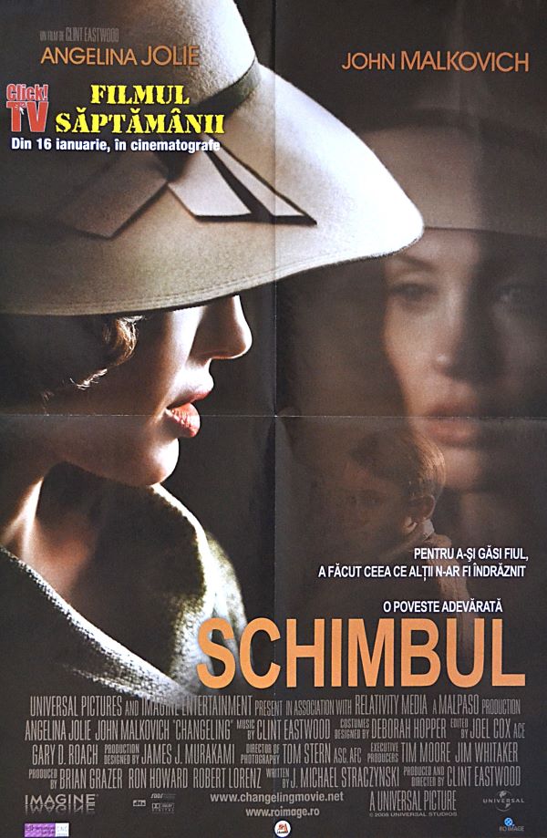 This striking Changeling (Schimbul) poster presents Angelina Jolie in side profile, shaded by a vintage hat, while her ghostly reflection lingers behind her. Soft sepia lighting and dramatic shadows evoke mystery and sorrow. Bold typography contrasts the subdued palette, hinting at a powerful true story about motherhood, injustice, and unbreakable determination.