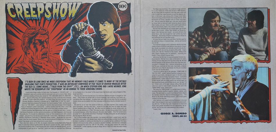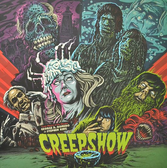 The artwork leans hard into EC Comics-style ghoulish color: slime-font title, lurid purples/greens, and a parade of monsters that mirrors the film’s anthology bite. The included interior art/liner layout (comic panels, production stills, and bold illustration) makes the whole package feel like you’re holding a lost issue of Creepshow—not just a record.