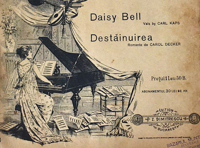 This is a music-salon poster/cover advertising a curated bundle of songs—think of it as an early “playlist drop,” printed on paper instead of pushed by an algorithm. It promotes pieces like “Daisy Bell” and “Destăinuirea”, along with the promise of regular issues (the old-school subscription model: Victorian Netflix, but with sheet music).