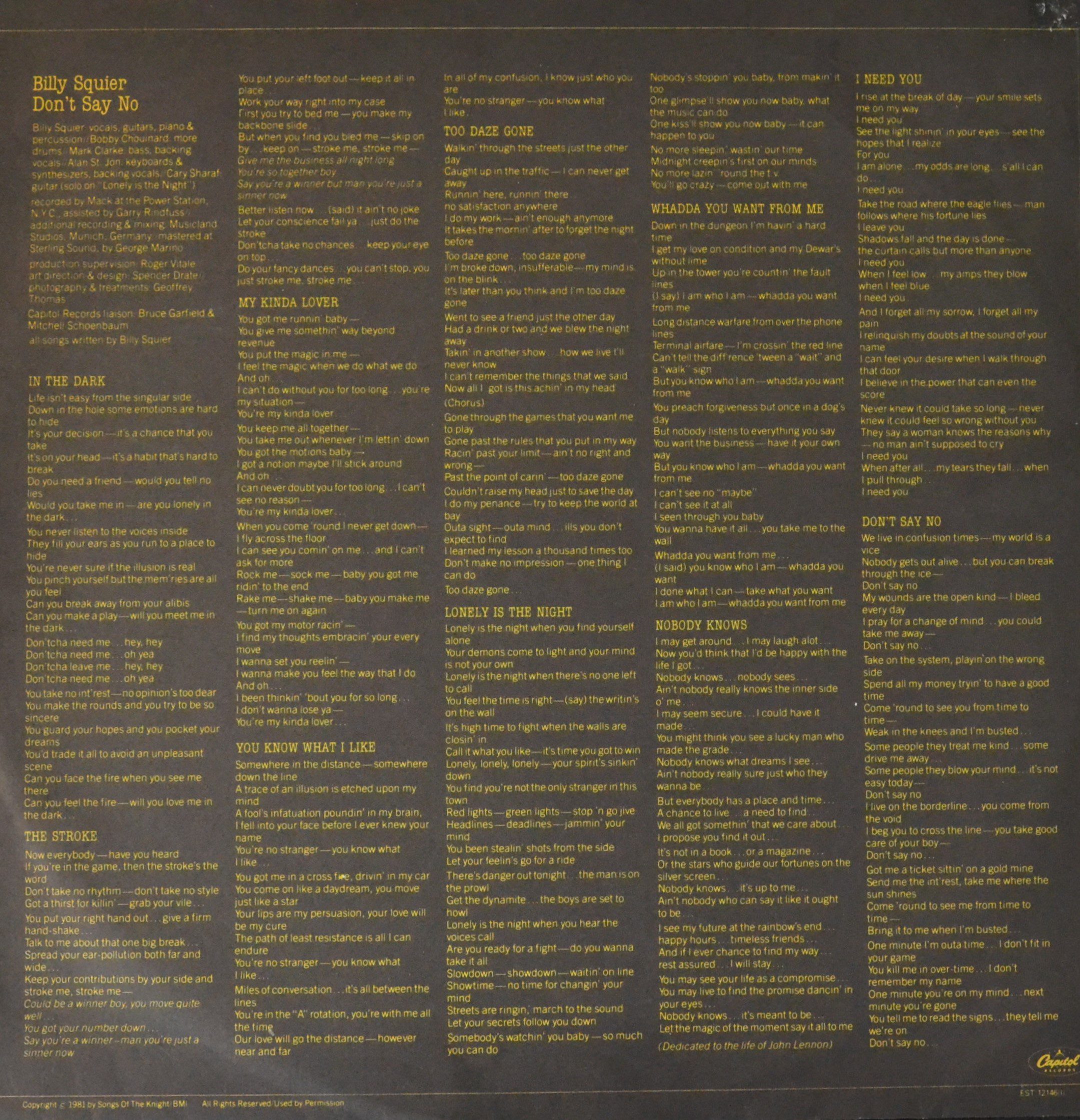 From the anthemic “In the Dark” to the relentless drive of “Lonely Is the Night,” “Don’t Say No” is a rollercoaster of dynamic storytelling and instrumental prowess. The lyrics weave tales of defiance and introspection, while the music is a rock composition masterclass. Standout tracks like “My Kinda Lover” showcase Squier’s ability to craft infectious and thought-provoking songs, ensuring their place in the pantheon of rock classics.