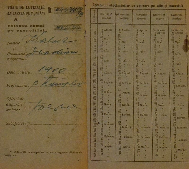 Image 1 (caption/alt): Romanian “Foaie de cotizație la cartea de muncă” — a contribution sheet tied to a workbook, with dated exercise periods and handwritten entries. This type of paper wasn’t meant to be beautiful. It was meant to be trusted. The handwriting, the structure, and the aging tell you it was used, not staged—exactly what collectors love.