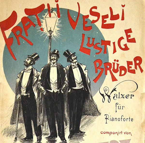 Vintage sheet‑music poster from Biblioteca Lirica, București: “Frati Veseli / Lustige Brüder.” Three jaunty brothers in top hats and sweeping capes pose beneath a glowing streetlamp, promising a spirited waltz for pianoforte. Bold red lettering dances across aged paper, celebrating composer Rob. Vollstedt and old‑world charm for any elegant soirée.
