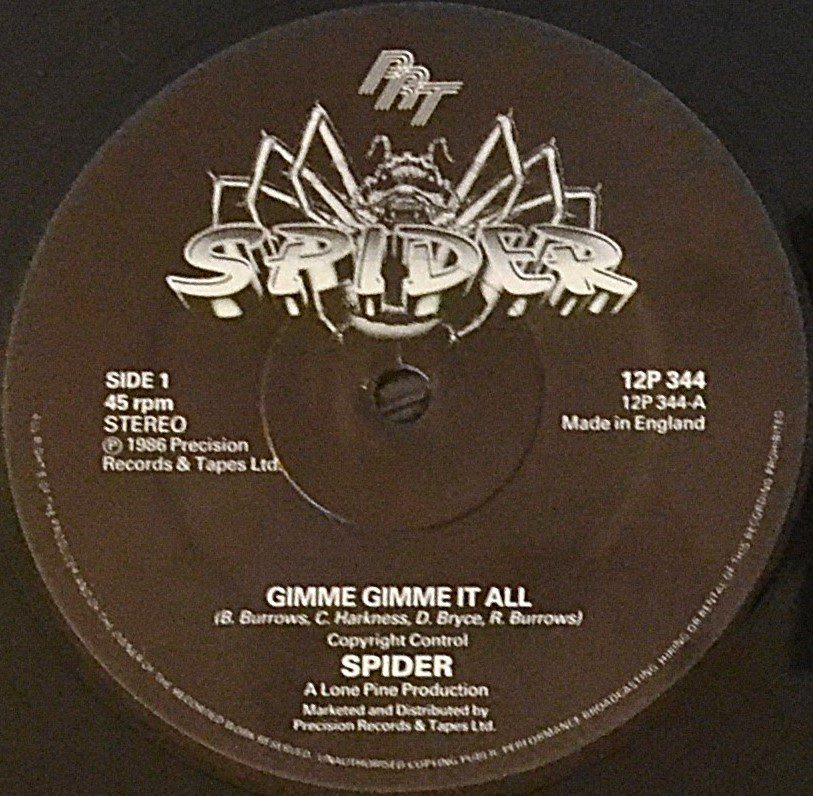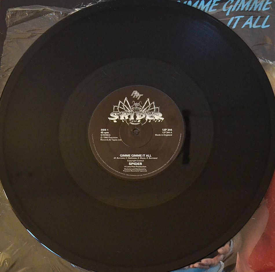 “Gimme gimme at all” (1986, catalog PRT 12P 344) is a punchy slice of mid‑’80s swagger from Spider, pressed as a 12″ single that leans into big hooks, big hair, and bigger confidence. It’s the kind of record you put on when you want your speakers to strut.