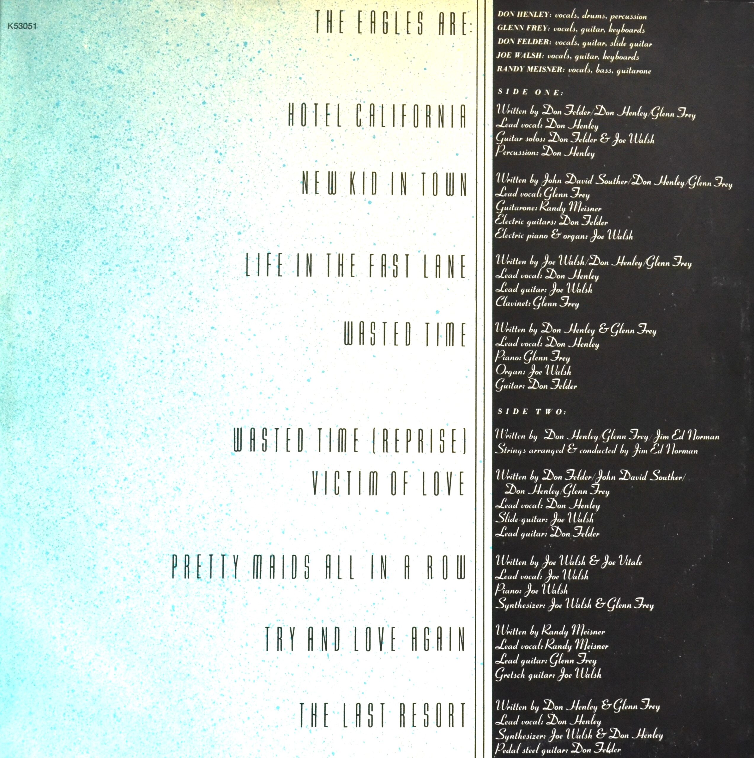 Other standout tracks include “Life in the Fast Lane,” propelled by Joe Walsh’s jagged riffs—a song, rumor has it, inspired by a real-life wild ride. “New Kid in Town” brings bittersweet harmonies and crisp production, while “Wasted Time” closes each LP side with heart-on-sleeve poignancy.