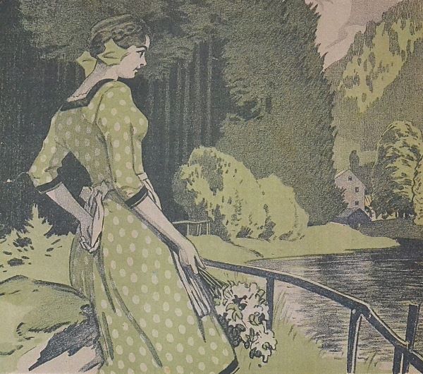 Vintage travel-style poster titled “Im Mühlenthal” shows a woman in a polka-dot dress standing by a riverside railing, holding flowers. Dark pine forests rise behind her, while pale hills and a quiet valley open in the distance. Muted greens and grays create a calm, nostalgic mood.