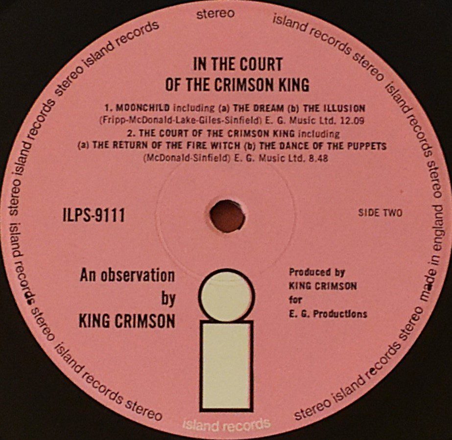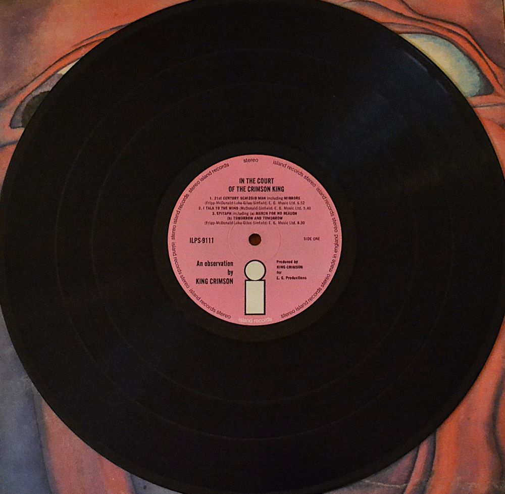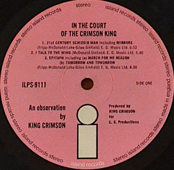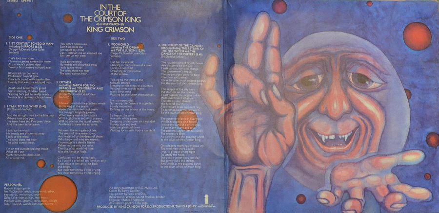 King Crimson’s 1969 seminal prog-rock masterpiece, In the Court of the Crimson King – An Observation. Island Records/Island Records Ltd.; produced e.g. Productions. Recorded at Wessex Sound Studios. Cut and pressed by Phonodisc Ltd. Published by E.G. Music Ltd. Made/printed by Ernest J. Day.