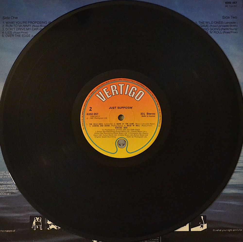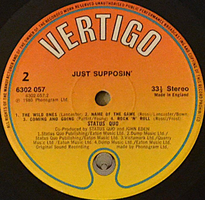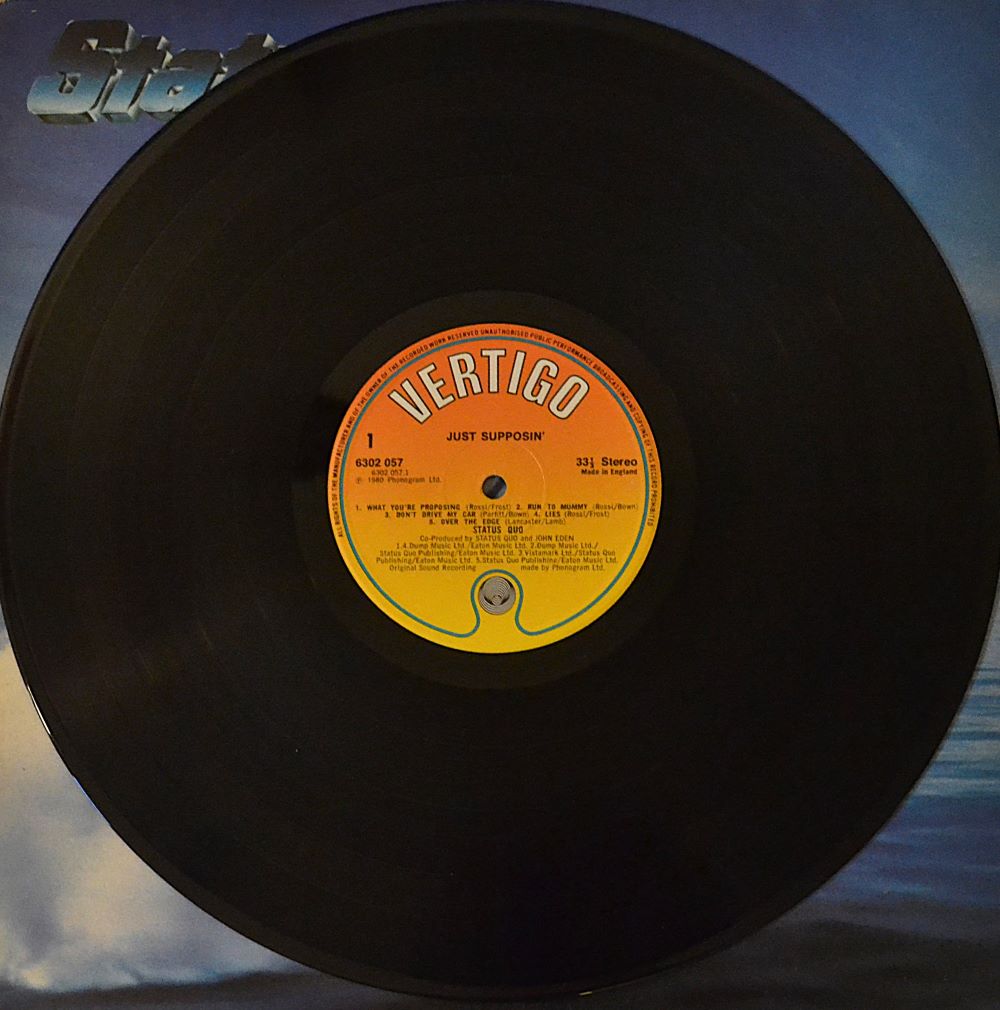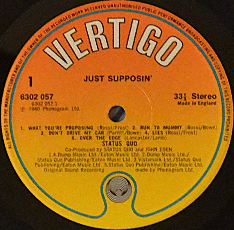 Explore Just Supposin’—published by Dump Music Ltd., Eaton Music Ltd., Status Quo Publishing, Vistamark Ltd., and Quarry Music Ltd.; ℗/© Phonogram Ltd.; pressed by PRS Ltd.; lacquer cut at The Town House; marketed by Phonogram; recorded at Windmill Lane Studios. Classic release.