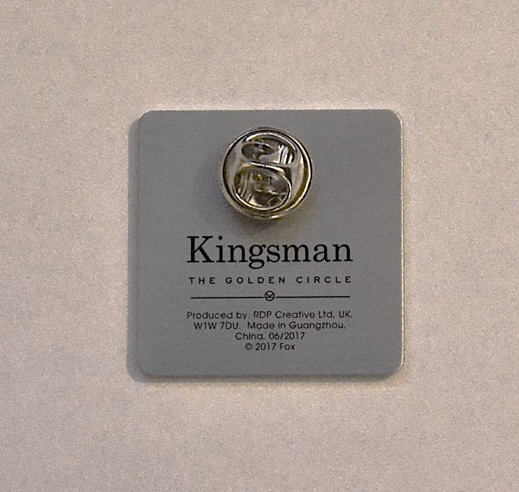 Official Kingsman: The Golden Circle pin badge featuring the iconic gold “S” emblem on a square, pale-metal face with fine border detailing. Butterfly clasp backing. Originally supplied on branded card and in black promotional packaging (“See the movie at Odeon”). Produced by RDP Creative, 2017. Made in Guangzhou, China, 2017.