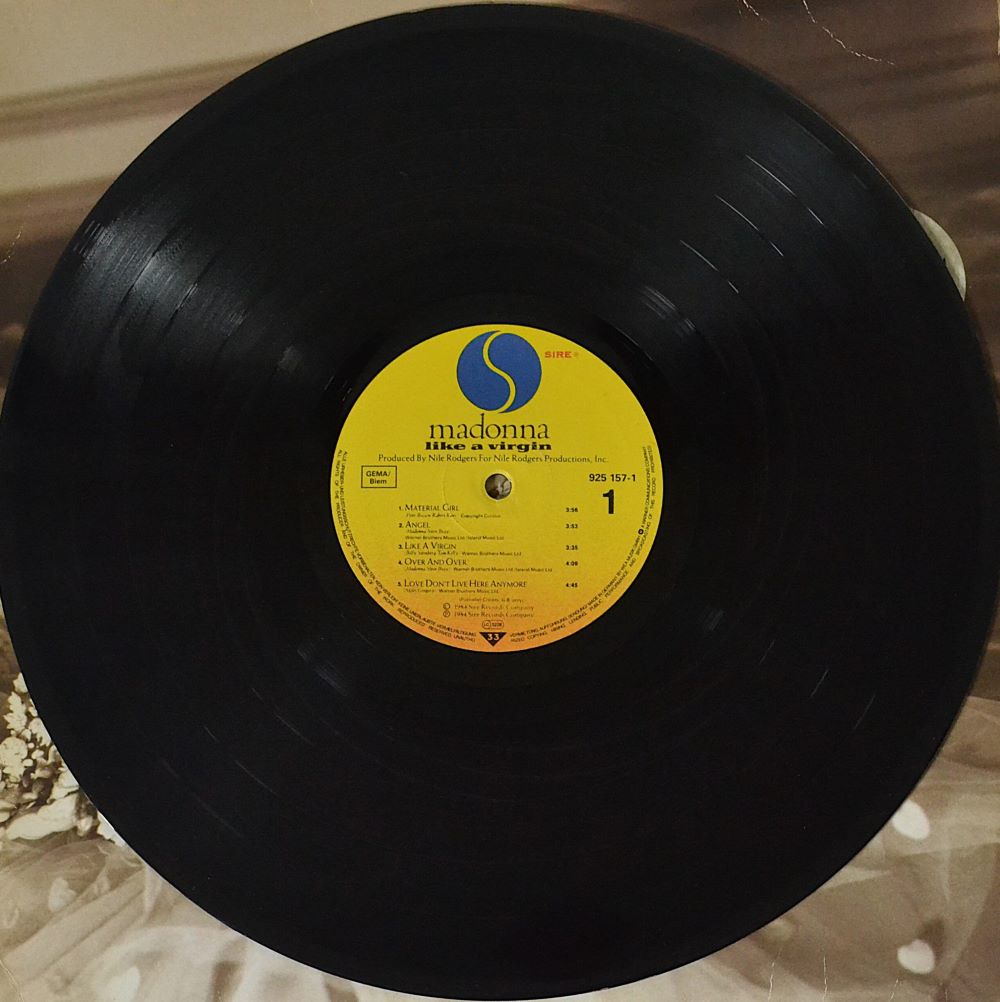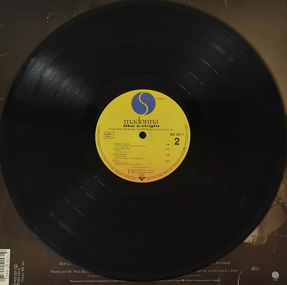 Iconic 1984 Madonna Like a Virgin vinyl, produced for Nile Rodgers Productions. Made by WEA Musik GmbH, manufactured and pressed by Record Service GmbH/Alsdorf; lacquer cut at Masterdisk. P/C Sire Records. Publishing: Warner Bros. Music Ltd., Island Music Ltd., Copyright Control. Punchy 80s pop classic.