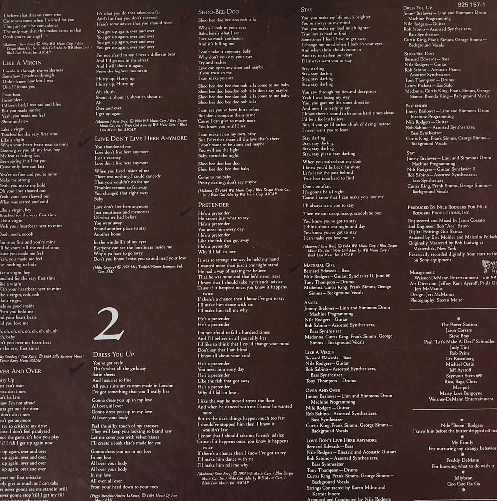 Like a Virgin is a neon-lit blend of dance-pop, funk gloss, and synth sparkle. Thematically, it’s a tug-of-war between romance and image, innocence and cunning—often in the same song. Nile Rodgers, fresh from producing David Bowie’s Let’s Dance, brought in the Chic engine room (Bernard Edwards on bass, Tony Thompson on drums) and wrapped Madonna’s voice in crisp guitars, buoyant bass lines, and radio-primed arrangements.