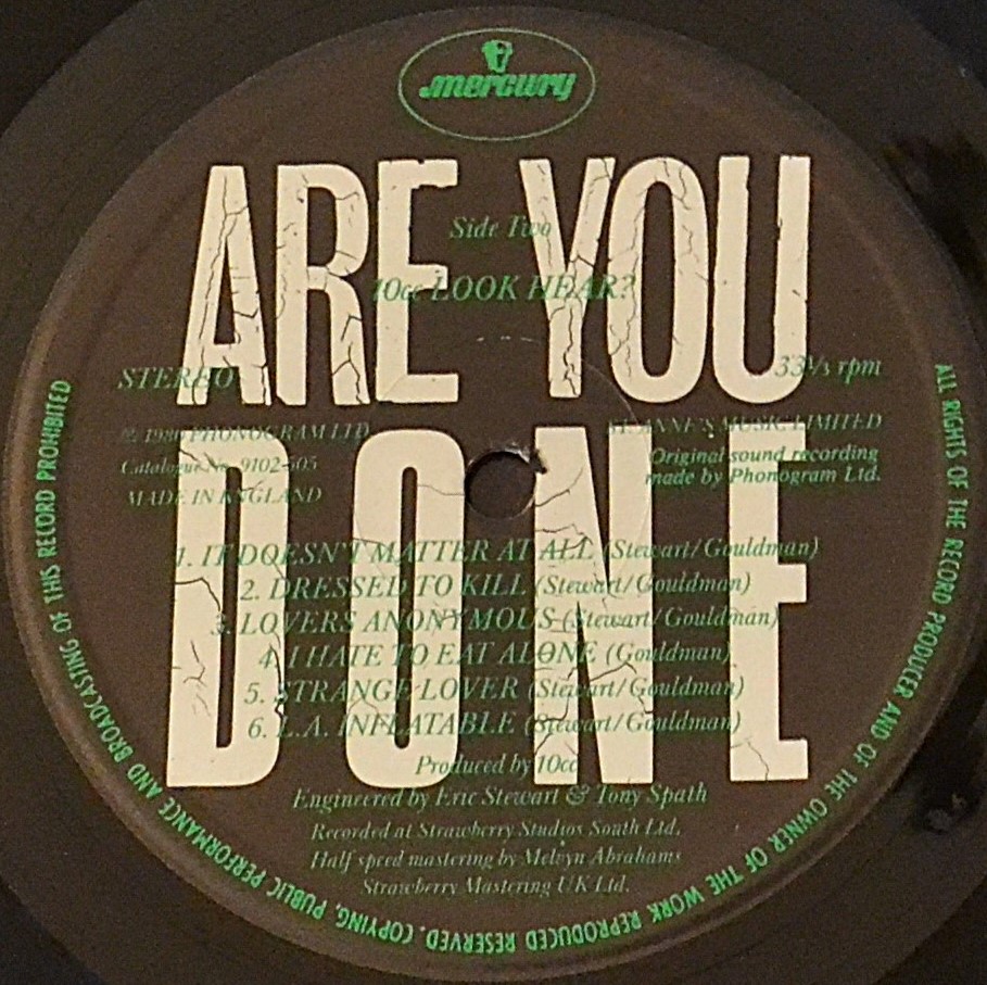 Phonogram Ltd. presents this ℗/© classic marketed by Phonogram. Recorded at Strawberry Studios South, engineered by Eric Stewart and Tony Spath, then mastered at Strawberry Mastering by Melvyn Abrahams. Produced by 10cc, packaged with Hipgnosis design and a George Hardie illustration—an audiophile-ready vinyl treasure cut for warmth, detail, and depth.