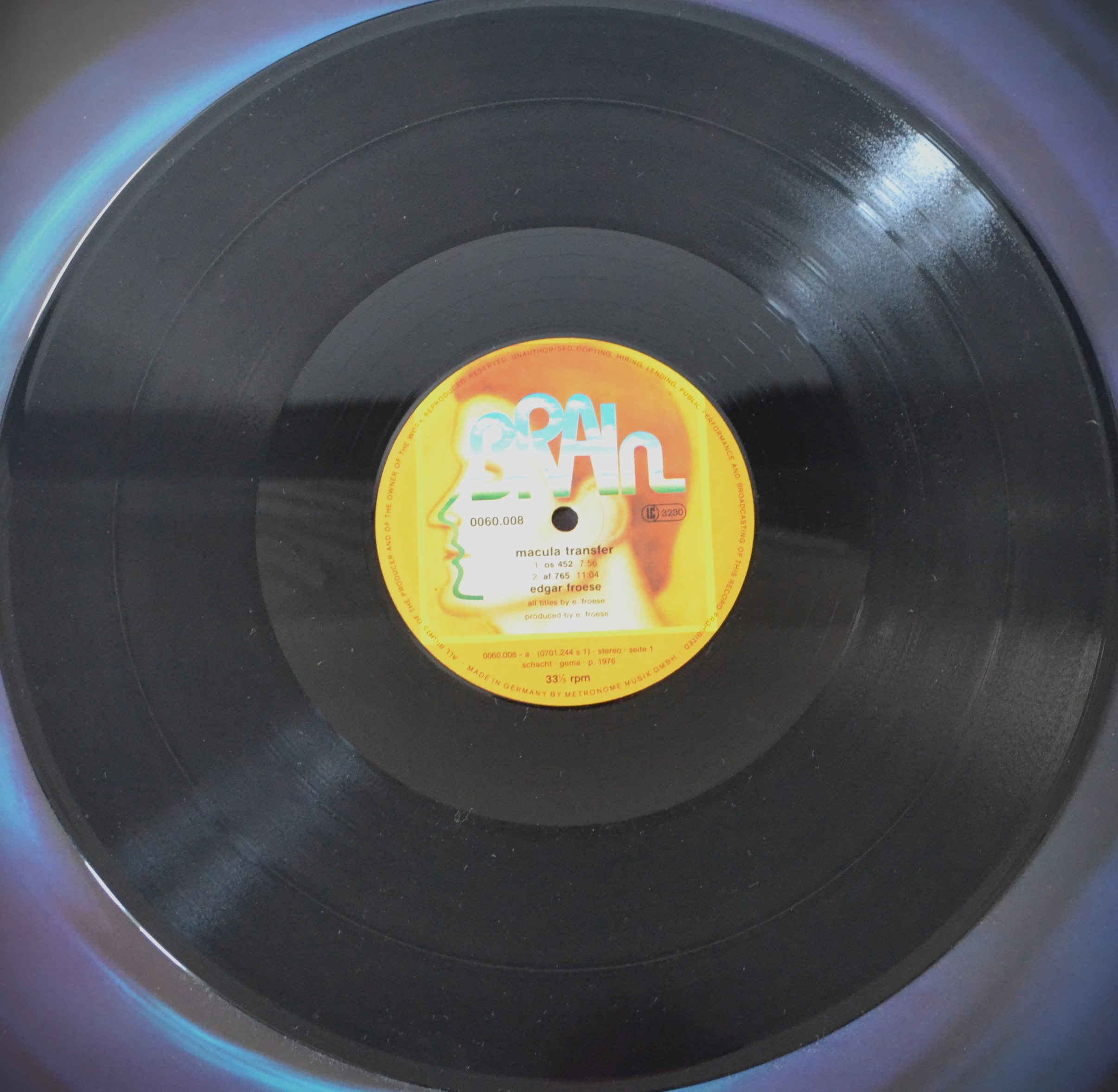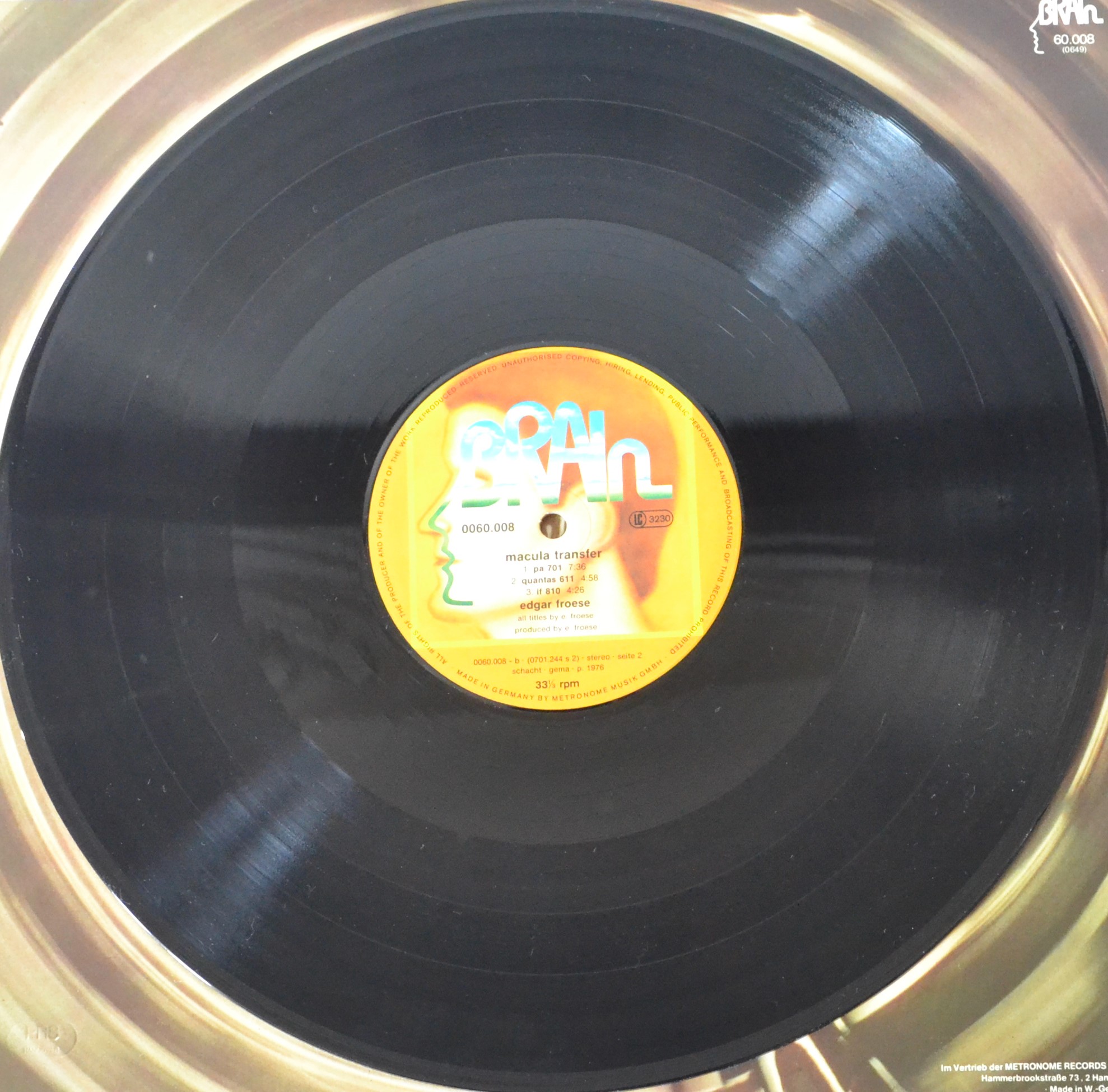 Let’s take a playful journey back to 1976, a time when the music scene was buzzing with innovation and creativity. Our destination? Edgar Froese’s mesmerizing album, “Macula Transfer.” Released under Brain catalog 60.008 (0649), this vinyl record stands as a testament to the pioneering spirit of the era. Froese, known for his work with the iconic band Tangerine Dream, brings a unique solo endeavor to life on this atmospheric album, which continues to captivate vinyl enthusiasts and electronic music aficionados alike.