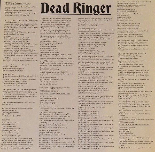 About the Record: Dead Ringer is an album combining hard rock, heavy metal, and glam rock elements. It is the second in the Bat Out of Hell trilogy, and features hit singles such as “I’m Gonna Love Her for Both of Us” and “Dead Ringer for Love”. The album is a classic in Meat Loaf’s discography and is known for its powerful vocals and theatrical performances.