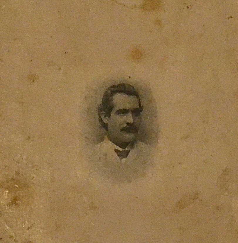 An antique sepia postcard features a tiny oval portrait centered on a heavily worn card, framed by thin border lines. Beneath the image, the printed caption reads “M. Eminescu.” The reverse side is blank, mottled with age stains and softened corners, suggesting long travel or careful storage in a collection.