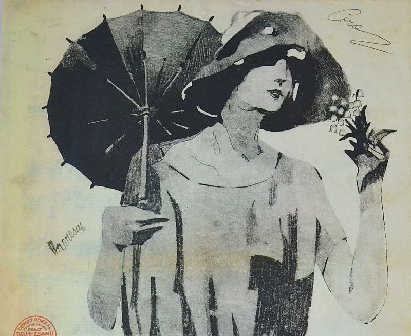 At first glance, you’re pulled into a soft, smoky drawing of a woman under a dark umbrella—half shield, half spotlight. Her hat tilts like a secret. Her lips are calm. In one hand, she holds delicate flowers. In the other, she grips the umbrella as if she’s about to step out of the paper and into a dance hall.