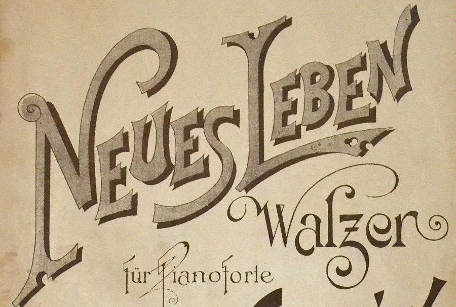 This vintage poster resembles a 19th-century sheet-music cover, celebrating “Neues Leben” (New Life) Waltz for pianoforte by Karl Komzák. Bold, sweeping typography and elegant flourishes dominate the warm, aged paper. Minimal imagery lets the ornate letters dance, evoking ballroom movement and nostalgic musical charm. An invitation to play and dream.
