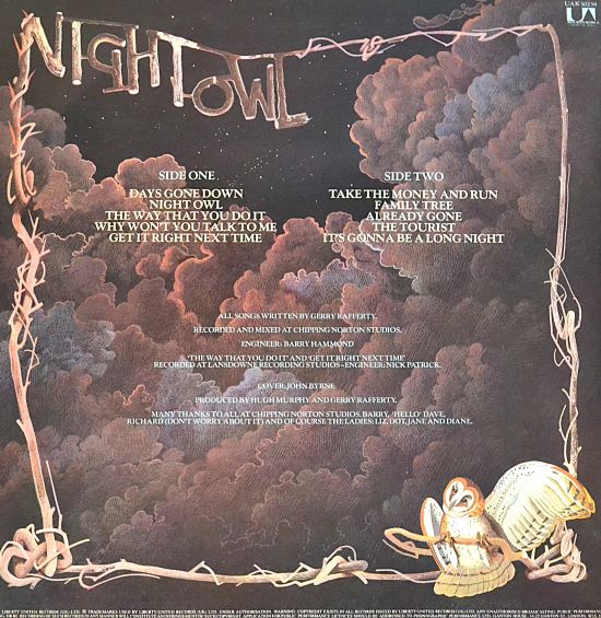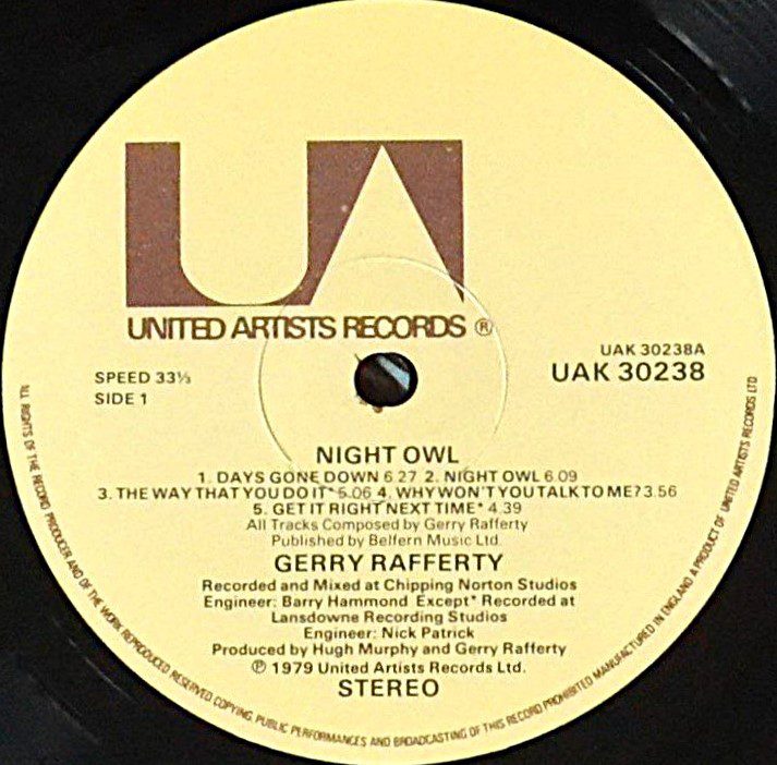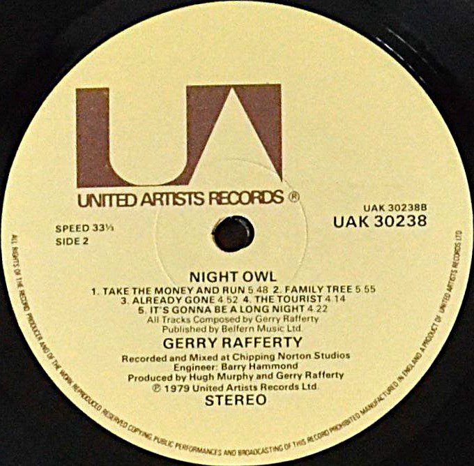 Released under the illustrious labels Belfern Music Ltd. and Liberty/United Records (UK) Ltd., “Night Owl” is a testament to Rafferty’s artistry. The phonographic copyrights are held by United Artists Records Ltd., ensuring a high-standard production. This album was meticulously recorded at Chipping Norton and Lansdowne Studios, capturing the intricate sounds and textures of each track.