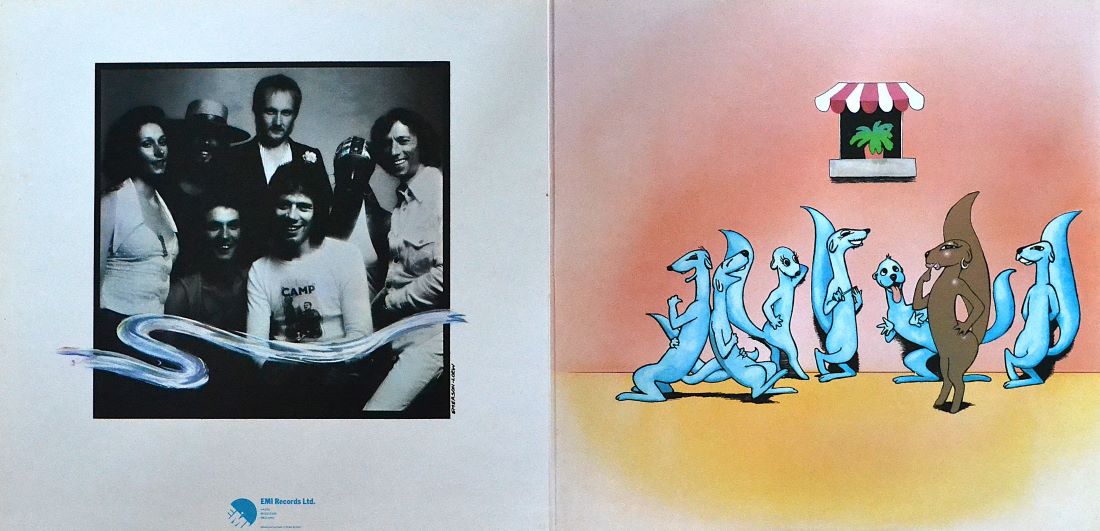 The artwork is pure mischief. A wide, sky-blue field, big friendly lettering, and a cartoon mink/otter character exhaling a ribbon of smoke that curls across the sleeve. Open it up, and you get a band photo on one side, and on the other a lineup of blue cartoon minks—plus one darker character—staring at a tiny window with a striped awning. It’s surreal, cute, and slightly pointed… a perfect match for a record that smiles while it sings.