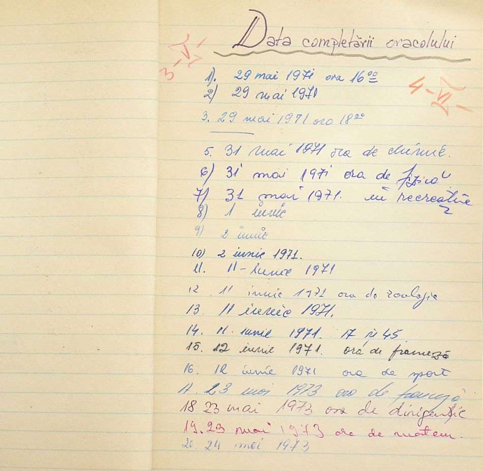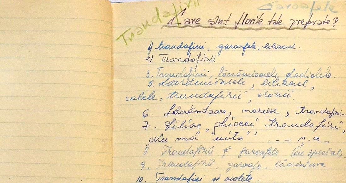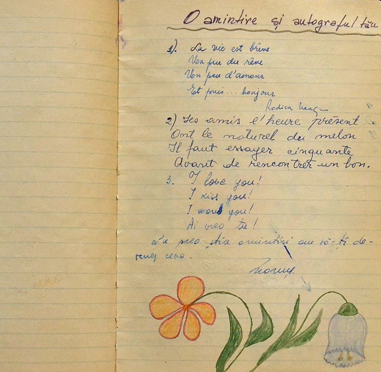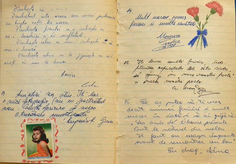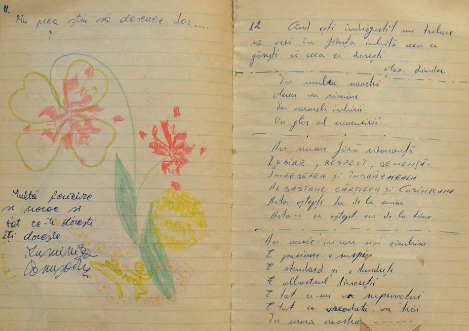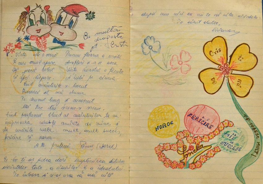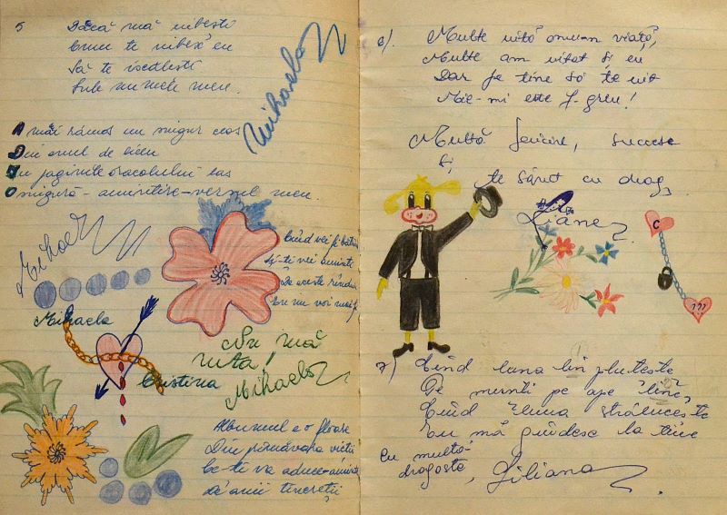 Romanian oracole became especially beloved in the communist decades, when private, handwritten culture had a special emotional weight. This example is a wonderful slice of that world: school-age voices, dated entries, favorite poets, music tastes, confessions, and beautifully naïve drawings.