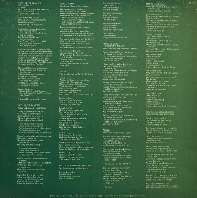 Recorded at RCA Studios, Hollywood, and produced for Nimbus 9 by Jack Richardson, this Epic release features Paul Cotton, Timothy B. Schmit, George Grantham, and Rusty Young, with keyboards by Burton Cummings. Mastered by Doug Sax at The Mastering Lab/Customatrix, plated and pressed at Columbia