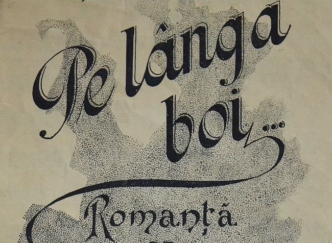 Vintage Romanian sheet music announces the romance “Pe lângă boi,” composed by Vespasian Vasilescu to verses by G. Coșbuc, arranged by A. Marisyas and published in Bucharest. The ornate cover lettering sits over a soft silhouette, while inside pages show piano-vocal notation and printed stanzas in neat columns today.