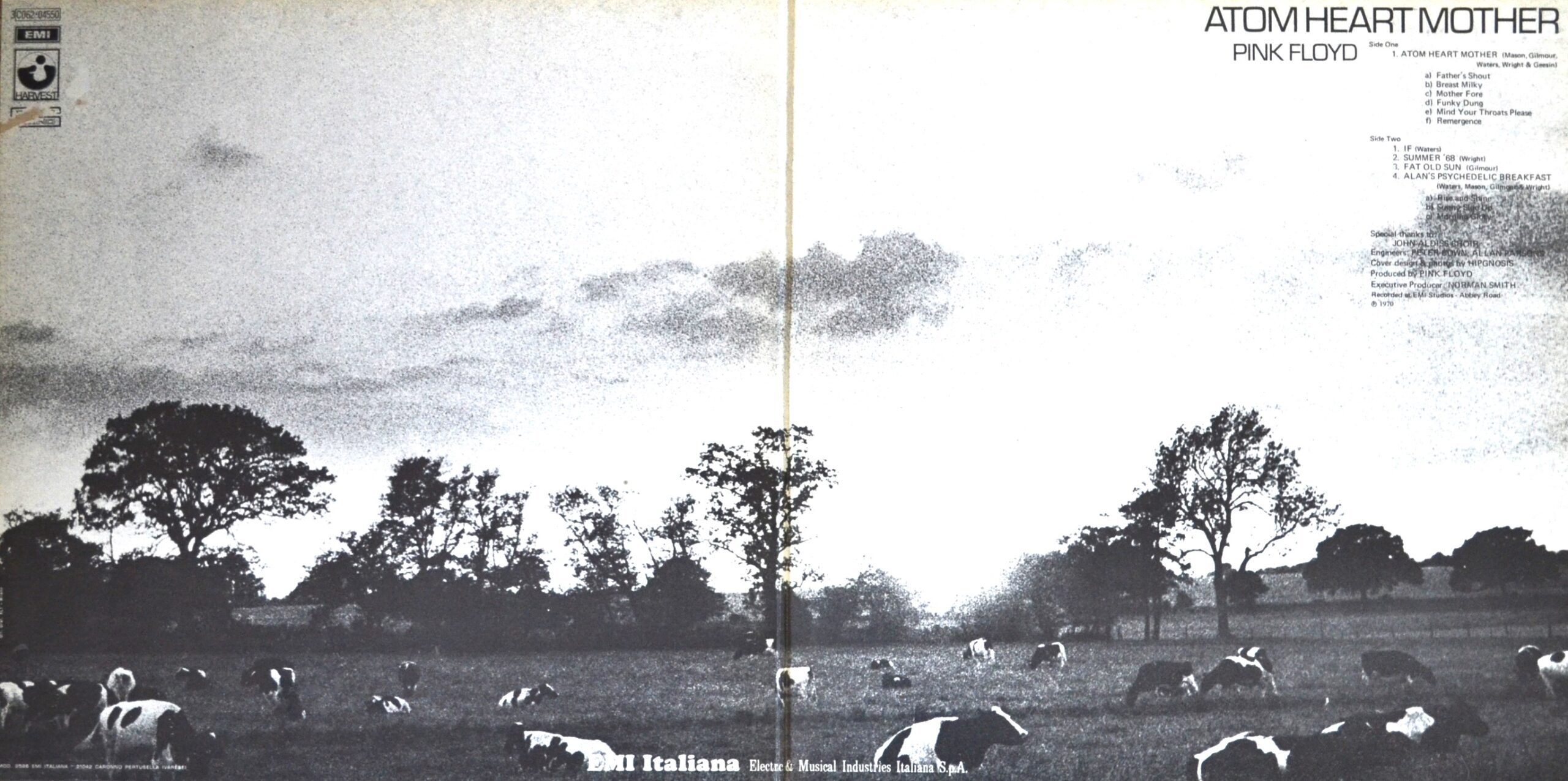 The cover of “Atom Heart Mother” is as memorable as the music itself. Eschewing the typical psychedelic imagery, the album features a simple yet striking photograph of a cow, grazing in a field. Designed by Hipgnosis, the cover art is a stark contrast to the complex music within, inviting listeners to form their interpretations. It’s a visual cue that this record is not about flashy gimmicks but rather the pure, unadulterated essence of music.