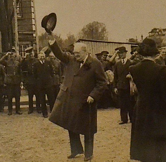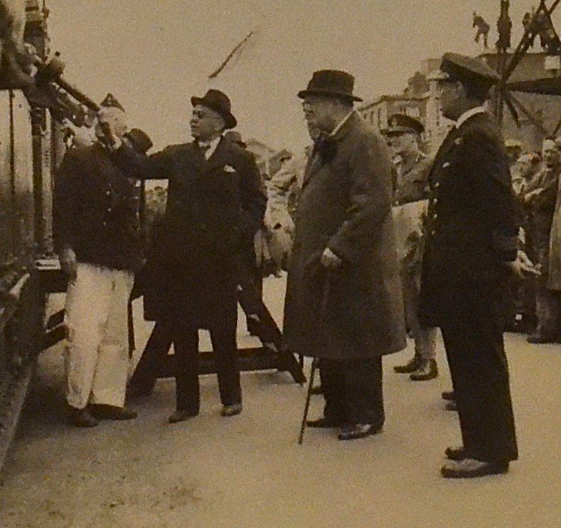 These wartime photographs capture a British leader’s public engagements: lifting his hat to crowds, inspecting naval equipment on a dockside, and walking past uniformed women during a formal greeting. The final frame shows the reverse paper stamp. Together, they evoke morale, industry, and ceremony amid World War II in Britain.