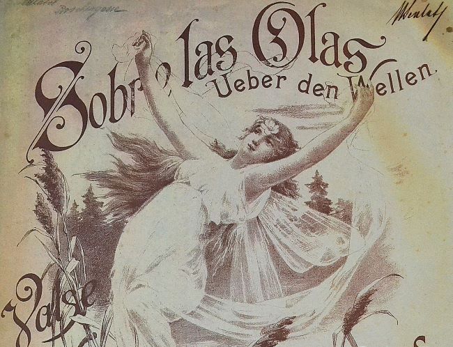 At first, it’s pure motion: a figure in flowing fabric seems to rise from reeds and spray, as if the wind itself became a dancer. The title—“Sobre las Olas / Ueber den Wellen”—curves like a wave, and the typography is just as theatrical as the scene. This isn’t only a picture; it’s an invitation to feel.