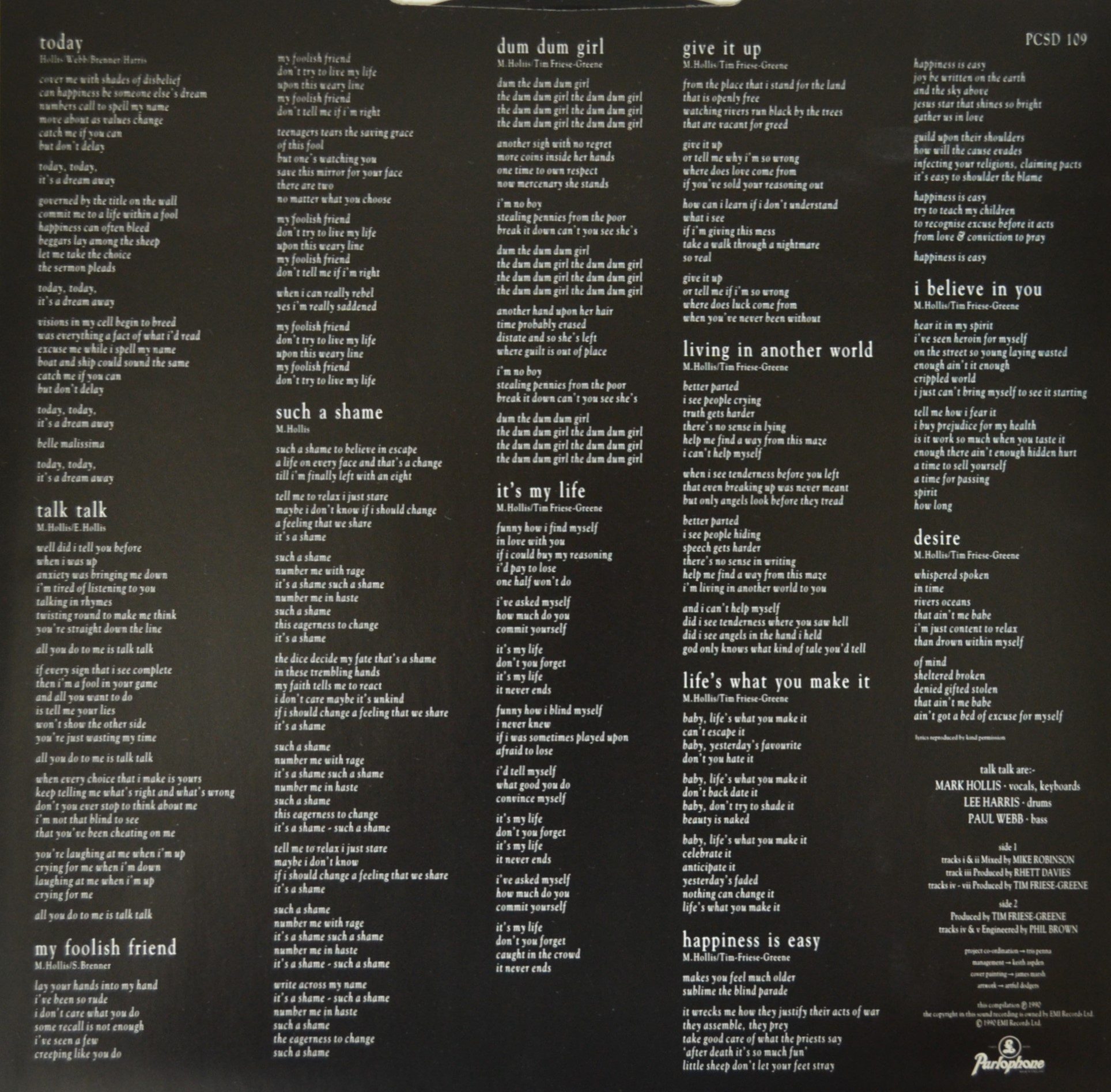 Other Recommendations: Fans of Talk Talk may also enjoy albums by other post-punk and new wave bands such as The Cure, Joy Division, and Echo & The Bunnymen.