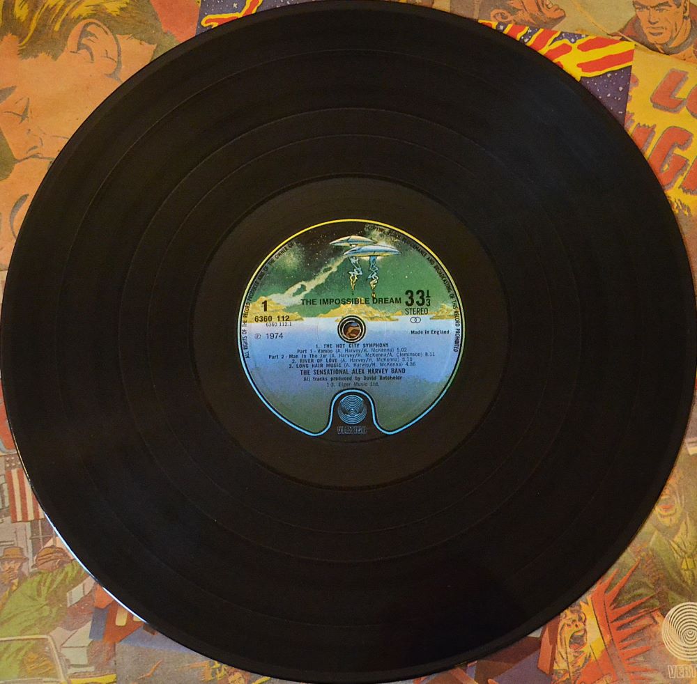SAHB sleeves often doubled as a curtain rise. The Impossible Dream’s packaging leans into the troupe’s theatre-of-the-streets identity: stylized, a little seedy, a little glamorous, and very self-aware. Typography and imagery nod to old show posters and fantasy serials—perfect for a band that treated albums like acts in a grand, ongoing performance. As a nice collector detail, 1974 copies appear on Vertigo’s “spaceship” label era, a neat period signpost for vinyl enthusiasts.