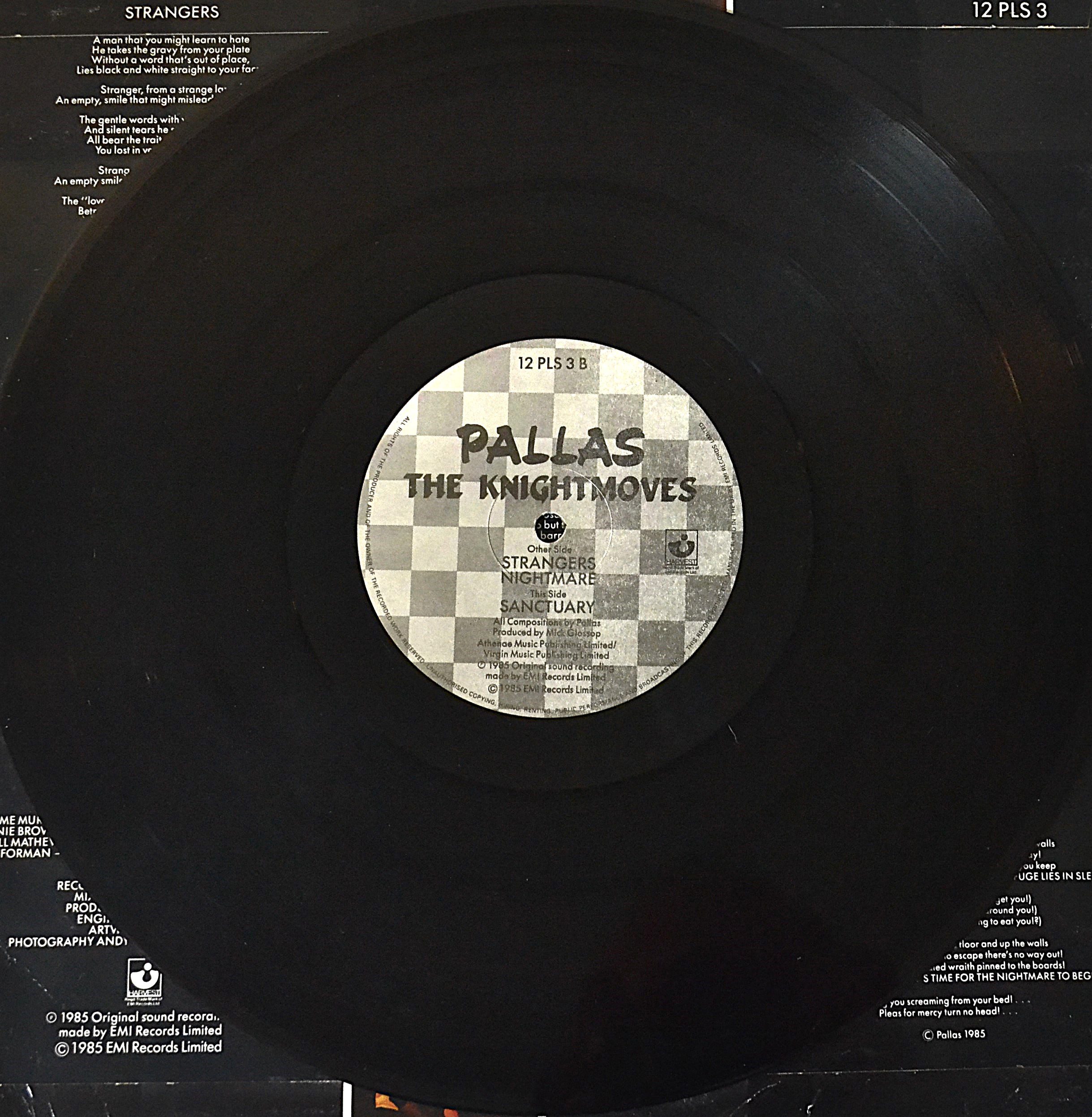 The Knightmoves is a music release with Phonographic Copyright ℗ and Copyright © held by EMI Records Ltd. and Pallas (2). Published by Athenae Music Publishing Ltd. and Virgin Music (Publishers) Ltd., it was recorded, mixed, and lacquer cut at The Manor and The Town House.