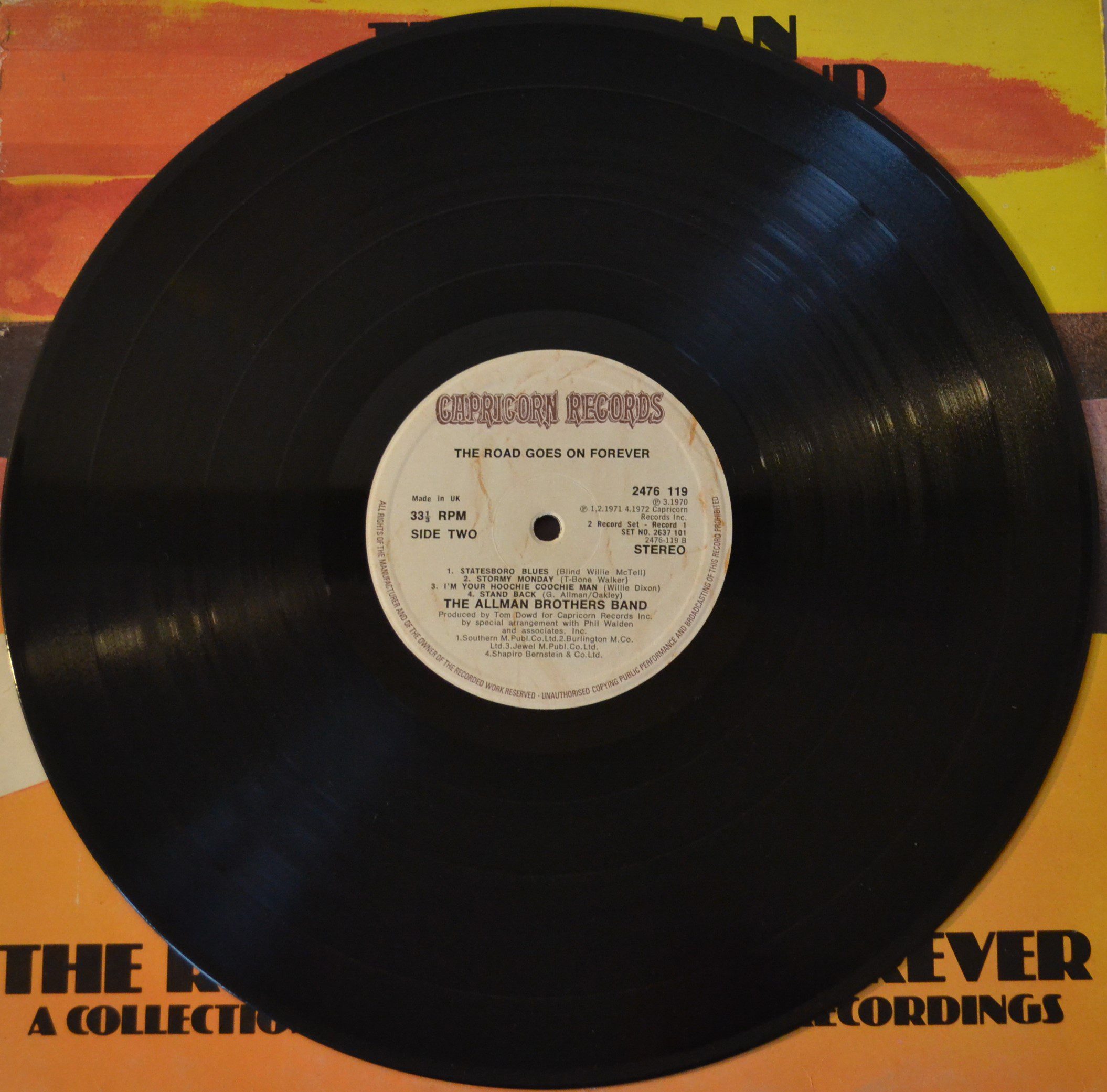 Dive into the timeless essence of “The Allman Brothers Band – The Road Goes On Forever,” a 1975 blues rock and southern rock masterpiece. This UK edition, catalog number 2637 101, is a vinyl treasure released by Capricorn Records and Polydor Limited (London), with production intricacies by Capricorn Records Inc. Crafted with care by MacNeill Press Ltd., Phonodisc Ltd., and adorned with compositions from Shapiro Bernstein & Co. Ltd., Southern Music Pub. Co. Ltd., Burlington Music Co. Ltd., Jewel Music Publishing Co. Ltd., Tristan Music Ltd., and Capricorn Records Inc., this record is a must-have for aficionados seeking the soulful journey of The Allman Brothers Band at their finest.