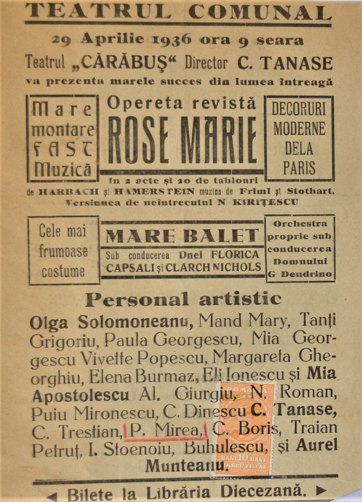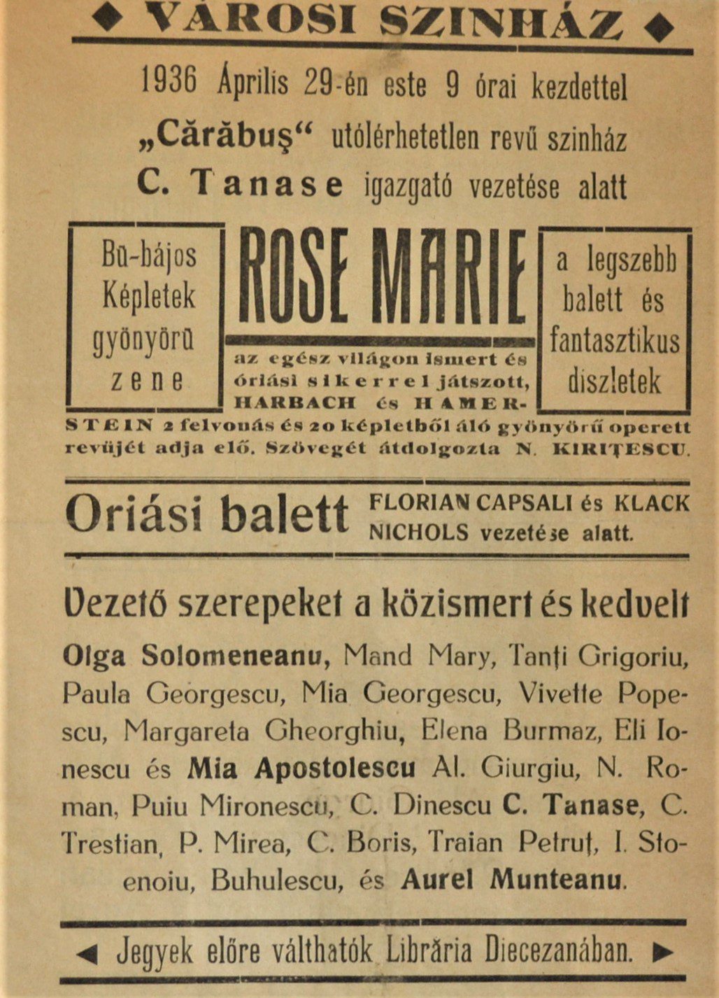 Experience the enchanting melodies of “Rose Marie” at Teatrul Comunal. Join us on April 29th, 1936, for an evening of romance and adventure. Don’t miss this captivating operetta performance!