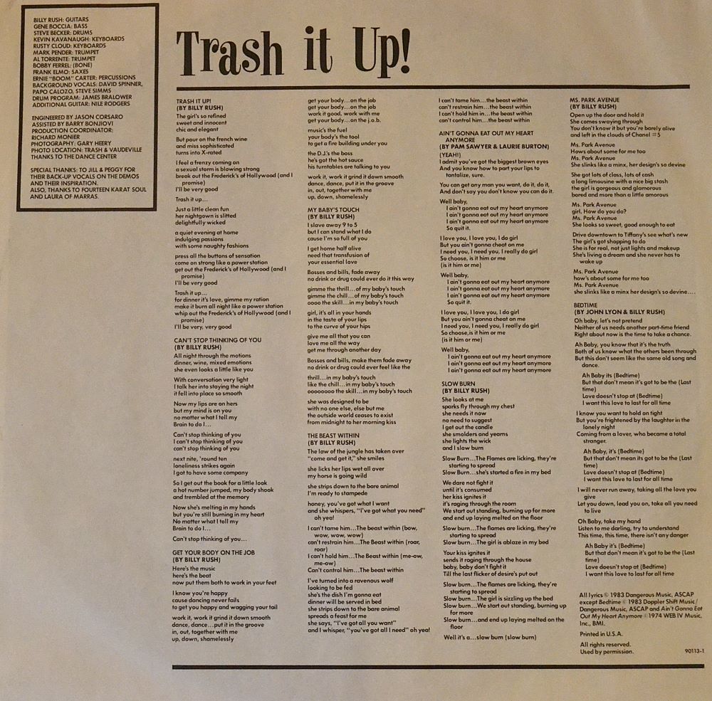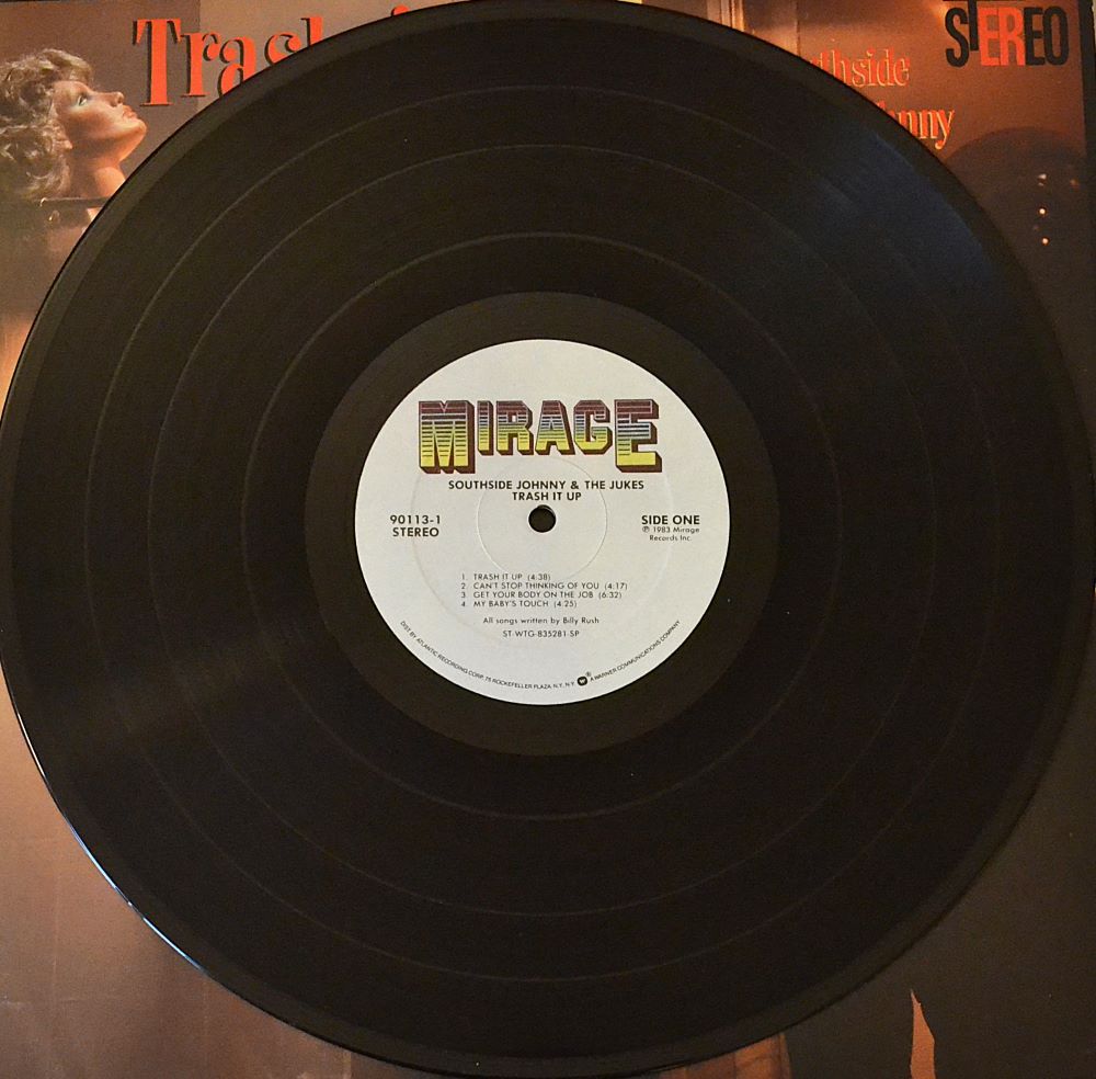 Celebrate an essential Mirage Records Inc. vinyl, Trash It Up, distributed by Atco Records and Atlantic Recording Corporation, pressed by Specialty Records Corporation, lacquer cut at Masterdisk. Publishing: Dangerous Music (4), Doppler Shift Music, Web IV Music, Inc.