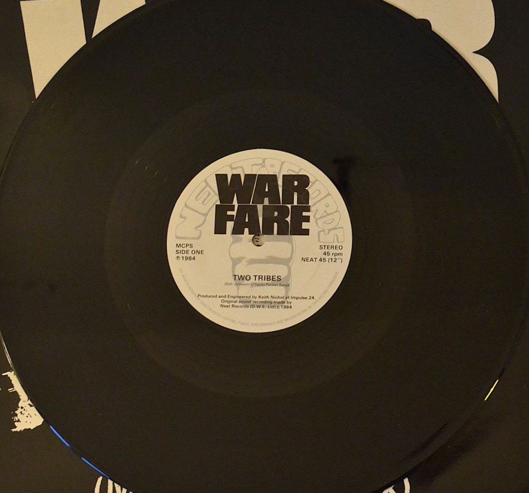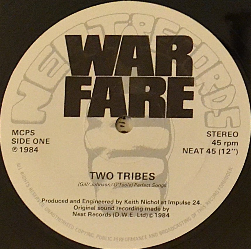 “Two Tribes (Metal Noise Mix)” is a 1984 12” single from UK rabble-rousers Warfare, pressed on Neat Records (catalog NEAT 45)—a label best known for helping the rougher edge of British metal hit wax. If you like your vinyl loud, raw, and slightly unhinged (in the best way), this is a cheeky little time capsule from the same era that birthed tape-trading, battle jackets, and riffs that sound like they were recorded in a lock-up after closing time.