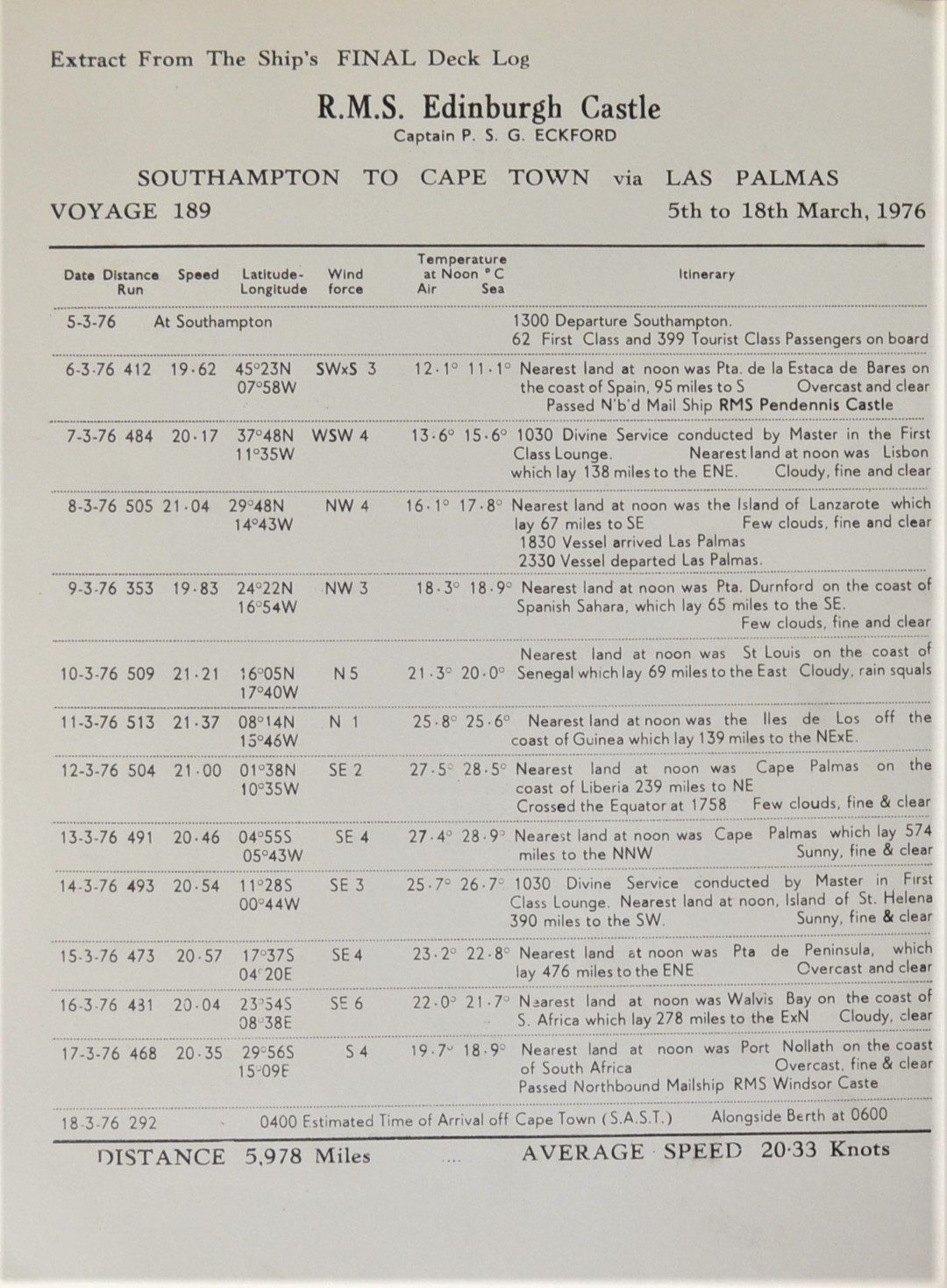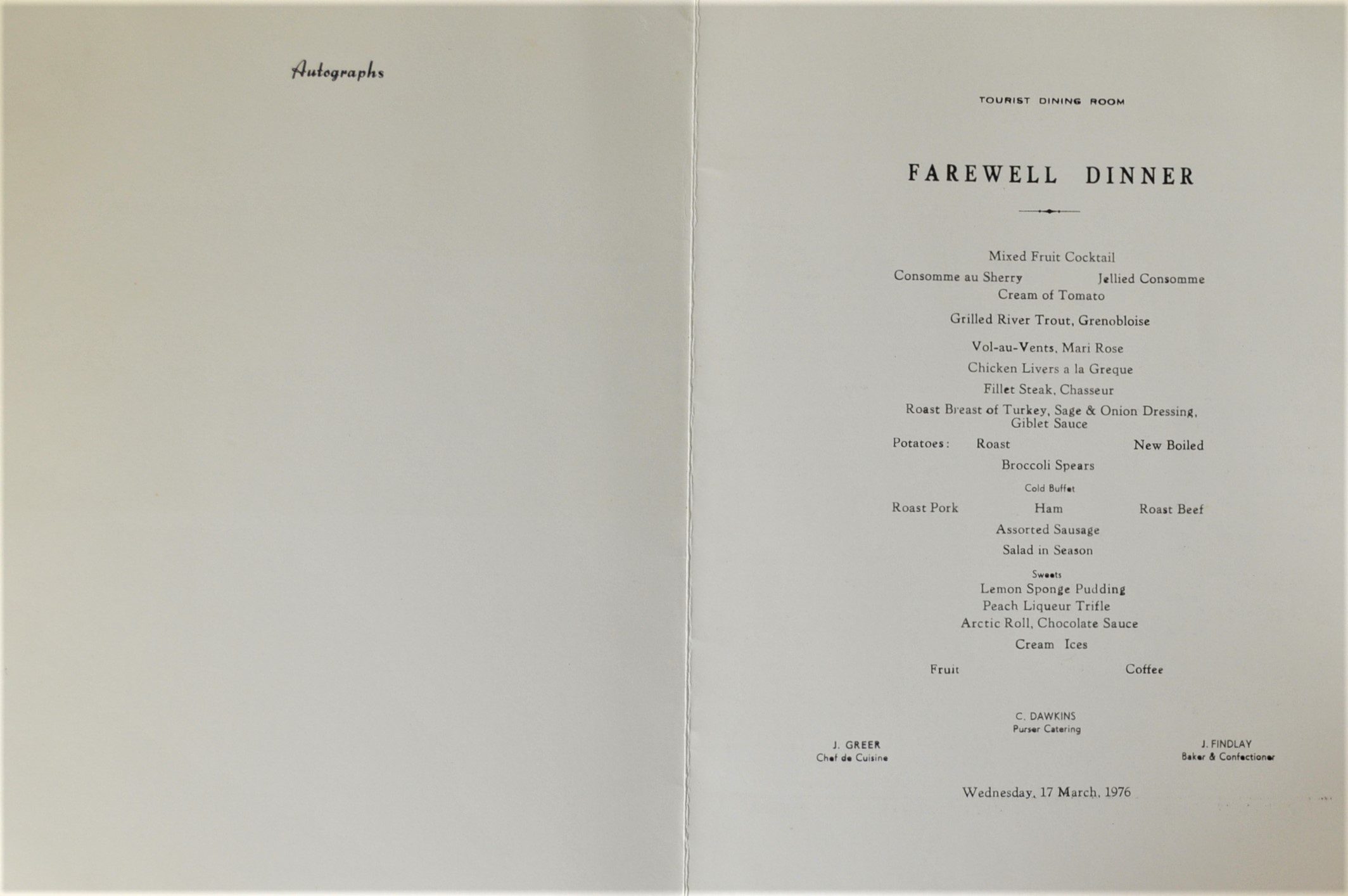 This collector’s item is a 1976 Farewell Dinner Menu from Union Castle’s R.M.S Edinburgh Castle. Provides a snapshot of dining history with intricate detailing and packaging, offering a vivid glimpse into luxury ocean travel in April 1976.