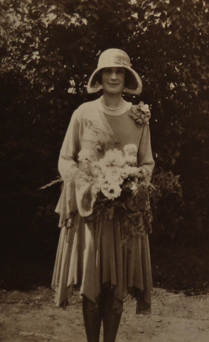 This vintage photo, portrays a British woman radiantly dressed in elegant attire. Her delicate beauty is accentuated with her frilly late Edwardian fashion-piece, exemplifying sophistication and aristocracy. A stunning hat embellished with flowers contributes to her aristocratic appeal. Her mild and enchanting gaze speaks volumes about the women of that age, embodying dignity and poise. The monochrome effect of the photograph adds a timeless charm reflecting the epoch it belongs to. This picture beautifully encapsulates the essence of early 20th-century nobility, elegance, and refined dressing sense.