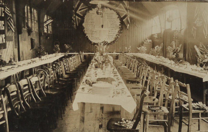 This vintage photograph, taken in early 20th-century Britain, exudes an atmosphere of sophisticated elegance. The scene presents a long, beautifully adorned table. Laden with fine china, polished silverware, and an abundant array of sumptuously prepared dishes, the table stands as the centerpiece in a grand room lit by soft, diffused light. Along the walls, flags and banners depict the period’s love for intricate detail and sumptuous design. This time-capsule image effectively captures the ambiance and social dynamics of a bygone era.