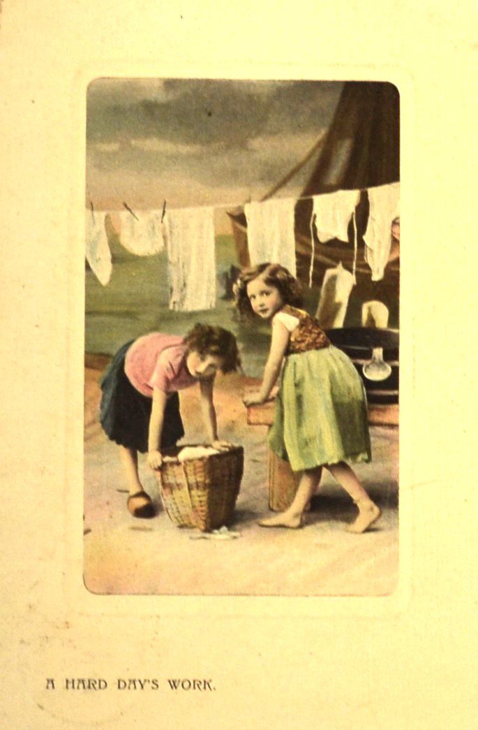 Discover unique pieces including this vintage postcard titled “A Hard Day’s Work,” illustrating children washing clothes. This age-old treasure is perfect for those passionate about history and vintage graphics.