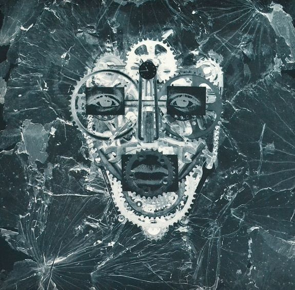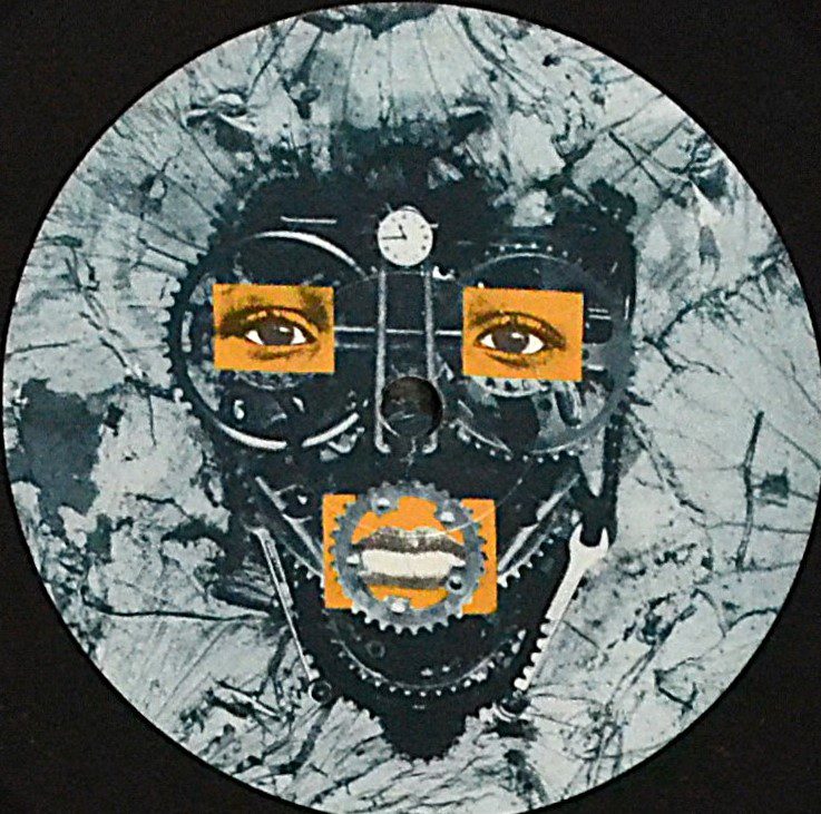 That cover is a beauty: a mechanical mask-face set against a cracked, marbled backdrop, with bold, blocky type. The eyes and teeth feel like collage cutouts, half-human and half-machine—perfect for an album obsessed with movement, momentum, and modern noise. Flip to the back, and the same mask shrinks into a wider scene, like you’ve zoomed out from a thought into a whole journey.
